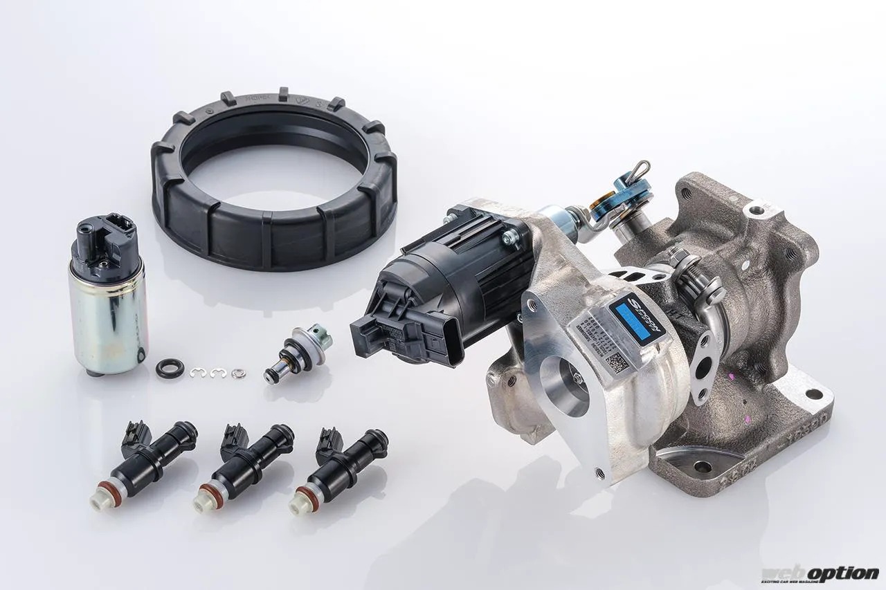 装着されているビッグターボチャージャーキット(27万5000円)はターボラグを抑えたバランス重視の設計で、コンプレッサー&タービンホイールを約10%大型化。大容量インジェクターや燃料レギュレーターなども同梱するフルキットだ。