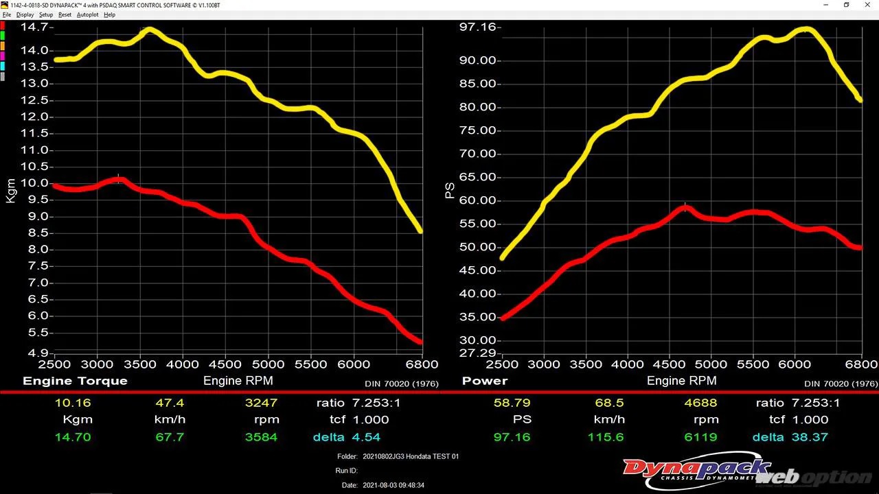 まずは吸排気チューンのCVT車から。テストは純正データで走行した後にHONDATAでステージ3データへチェンジ。ステージ3は吸排気チューン対応のハイオク仕様で、シャーシダイナモ上では15.85psアップを実証しているというからハンパではない。なお、コースは全長約1kmの富士スピードウェイ・ショートコースだ。