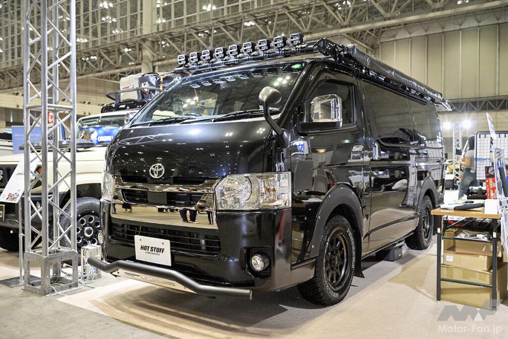 ホットスタッフは、メーカーからパーツを仕入れショップ等へ販売する卸業のほか、オリジナルホイールを開発するメーカー業を生業としている。同社は昨今人気のオフスタイルを応援しており、出展ハイエースもそれを意識したカスタムが複数実践されていた。