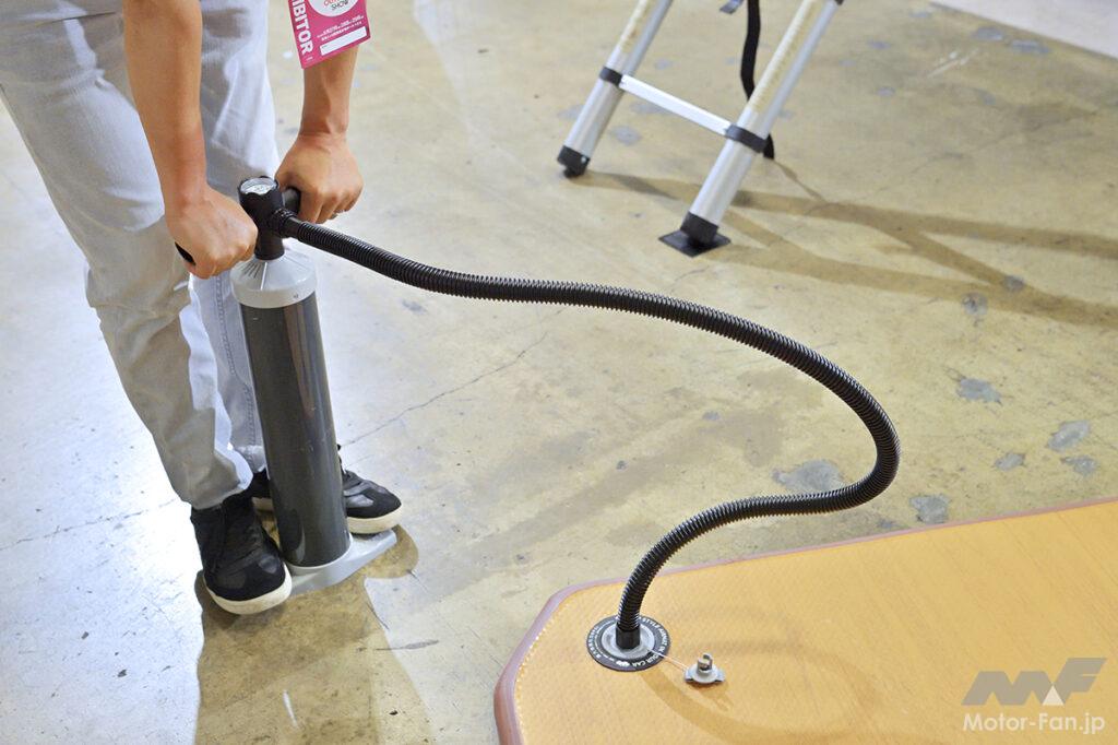 イチオシはエアマット。専用設計のピッタリフィット仕様で、展開は付属の空気入れを使ってわずか1〜2分で完成する。実際に車内に敷いても凸凹なしと寝心地満点だ。完全フラット化が可能で、車外に持ち出してヨガマットやレジャーマットとしても使うこともできる。一方テントは最大3人寝れるゆったり仕様。油圧式で展開格納も楽。通気性や寝心地にも配慮しており、写真のほかに、2人用の別モデルもある。