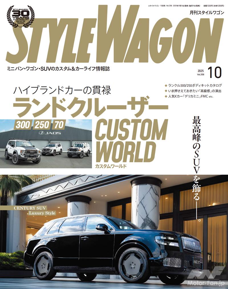 アイテム(カスタム) 最高峰のSUVをカスタマイズする! トヨタ・ランドクルーザー情報が満載の『スタイルワゴン10月号』は9月16日発売【写真・4枚目】 圧倒的な高級オーラを放つ現行のセンチュリー。その重厚ボディに合わせたホイールマッチングは必見。 人気のランクルシリーズ最高峰である300。未だ入手が困難と言われているが、街中ではだいぶ見かけるように。車格に合ったホイール選びからボディキットまで、注目アイテムも多数。 ランドクルーザーの中でもカスタム的には主力となってくる250。オフスタイルはもちろん、街中で映えるストリートスタイルまで、さまざまなコーディネイトを提案。 人気のコンパクトミニバン「シエンタ」をタイヤ&ホイール交換でおしゃれにスタイルアップ。少しアウトドア系も意識したマッチングは必見。 ヒットメーカー「クール」の大感謝オフ会の模様もレポート。300台オーバーのマシンが富士スピードウェイに大集合。インパクト系からシンプル系まで、多種多様な仕様を見ることができる。 今月の「車中泊に最適なクルマ選び」では、おしゃれなEV車として話題の「ヒョンデ・マウナロア」でリアルレポート。その広さや快適性&積載性などをチェック。 この画像の記事を読む