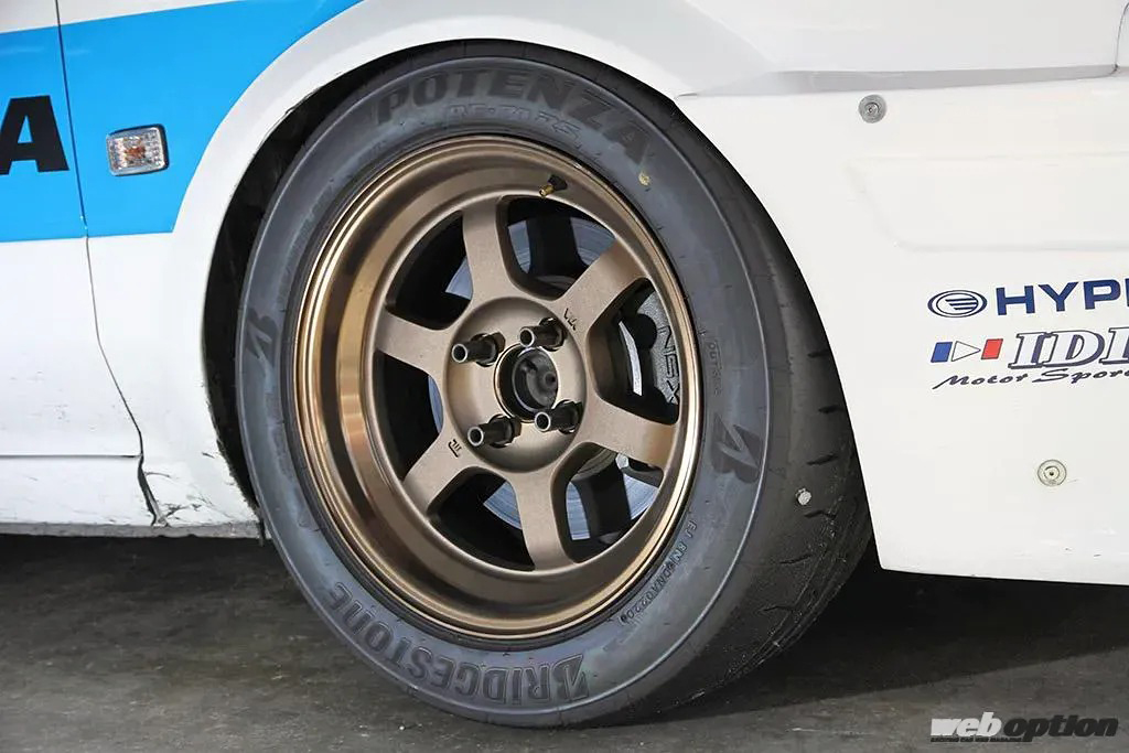 ホイールはボルクレーシングTE37Vで前後7Jオフセット18。そこに195/55R15サイズのポテンザRE-71RSが組み合わされる。スポーツラジアルにも関わらず、SタイヤRE-11Sのハードコンパウンドよりグリップすると言われるアレだ。