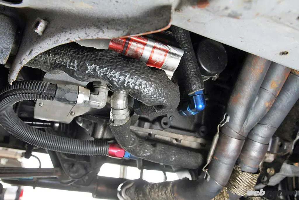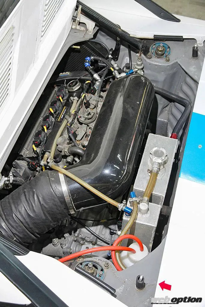 ミッションにはZZT231用6速MTが組み合わされる。デフサイズの大型化に伴いドライブシャフトにはZZW30用を流用しているが、エンジン(とミッション)の搭載位置が下がることでドライブシャフトが上向きになってしまう。それを緩和するため、エンジンは前に傾けて搭載される。インダクションボックスの後ろに確認できるタンクは、ドライサンプ用のエンジンオイルタンクだ。