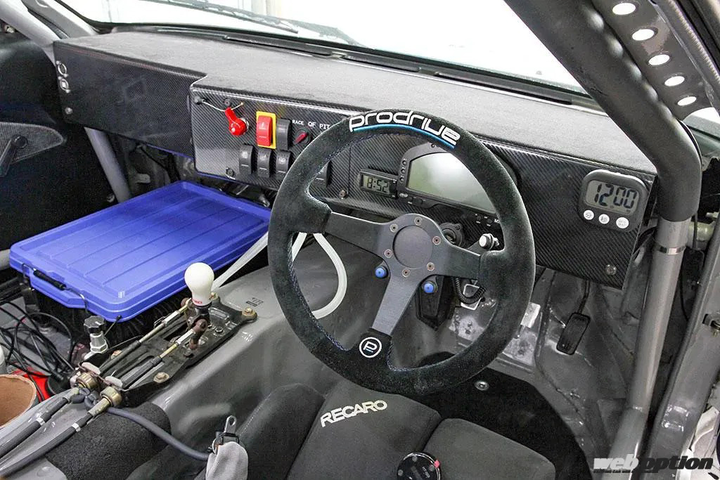 ダッシュボードはワンオフFRP製。表面をカーボンシートで仕上げている。メインメーターにはAIM製ダッシュロガーを採用し、クルマの各種情報を集中管理。ロールケージは左右サイドバーが追加された8点式で、前はバルクヘッド、後ろはリヤウインドウを貫通し、それぞれストラットタワーまで延長されている。