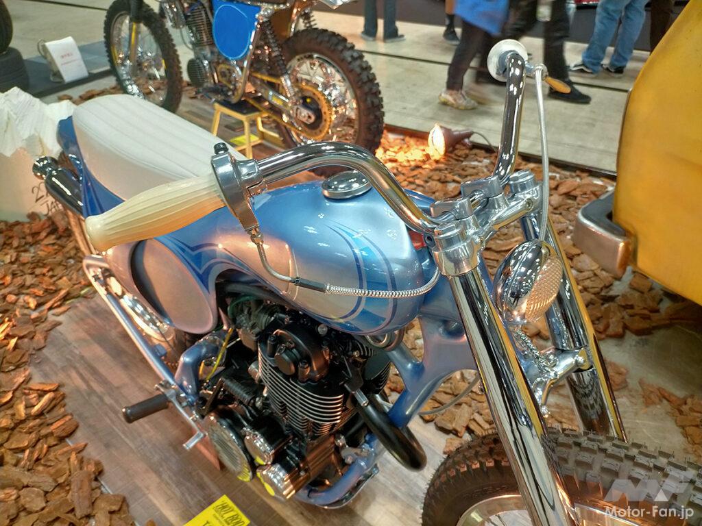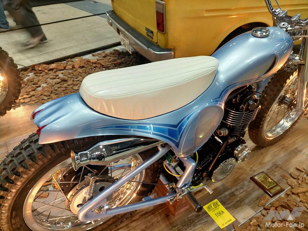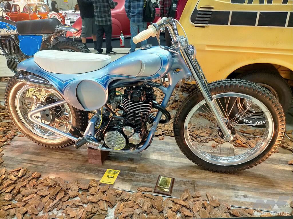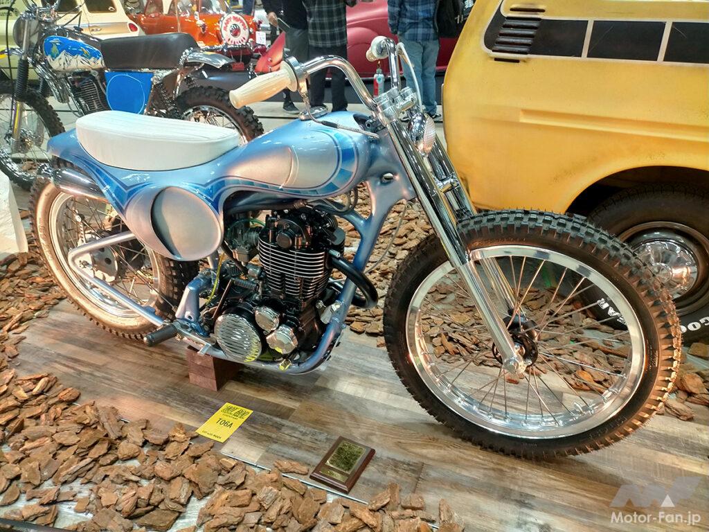 写真は絶版ビンテージモデルのヤマハXT500をベースにしたダートトラック風カスタム。タンク・シート・サイドカウル・テールカウル・リアフェンダーは、すべてが一体となった流れるような“トレイシー・ボディ”にカスタマイズ。