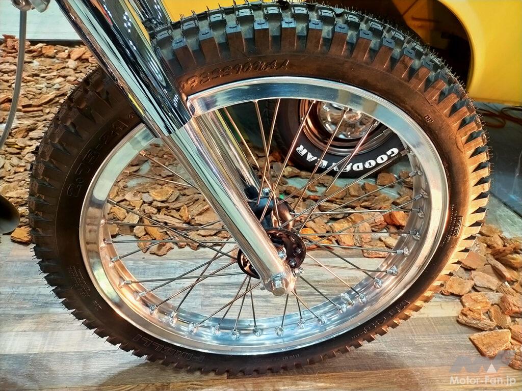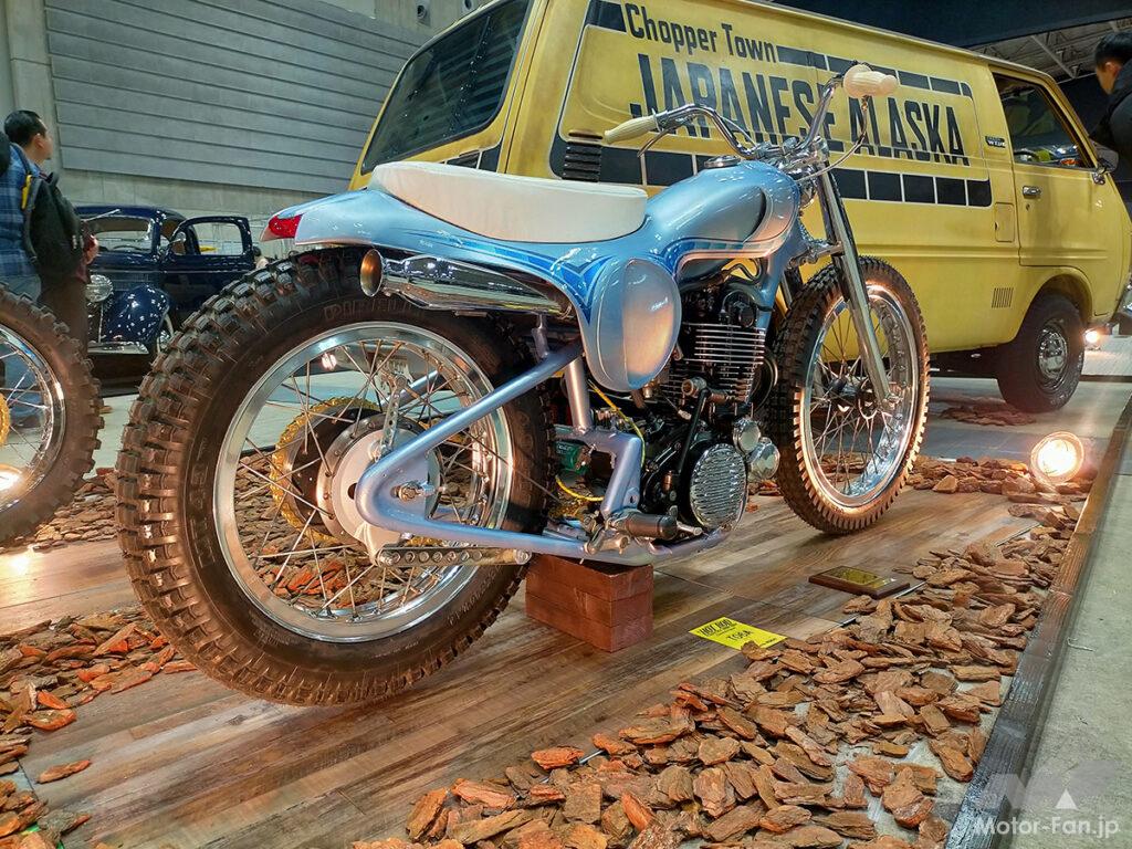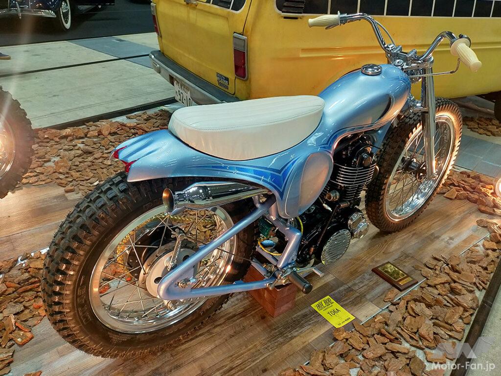 写真のカスタムはフレームをワンオフ製作し、リジッド式フロントフォーク&リアショックなどを導入。エンジンは1978年以降、SR400/500に継承される、XT500の空冷4ストローク単気筒SOHC 2バルブを搭載。一体感あるボディ、アップハンドル、ブロックパターンタイヤにも注目。