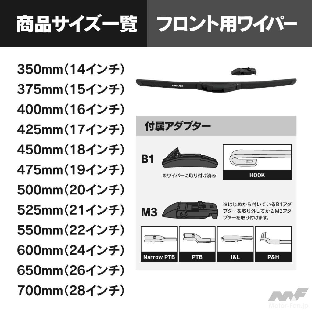 KIMBLADEワイパーは、幅広い車種に対応するために様々なアダプターを用意。多くのドライバーにその違いを実感してもらえるだろう。