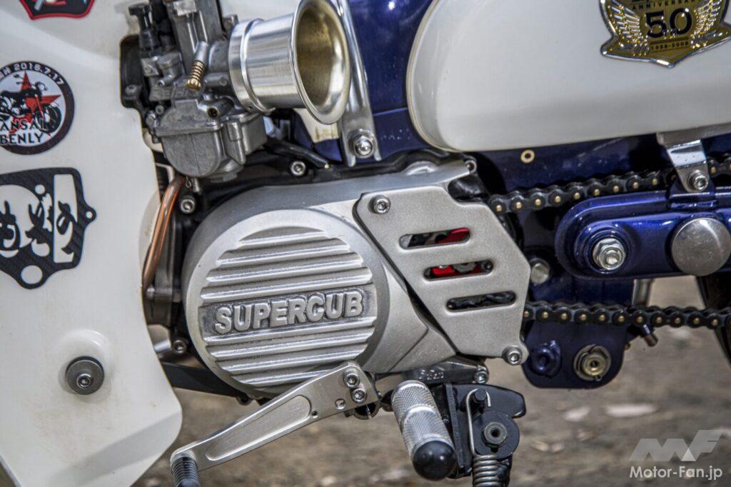 キャブレターはPWK28としてボアアップしたエンジンにセッティングしている。チラッと見えるサイドカバーは50周年スペシャル用で、部品単位で購入したもの。またクラッチ仕様の5速ミッションなのでシフトペダルも通常のつま先だけで行えるものとしている。SUPERCUBの文字が入るクランクケースカバーは正体不明なのだが、おそらくキジマの試作品とのこと。