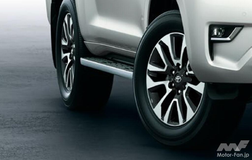 ランドクルーザーの弟分で、クロカンSUVながらプレミアムな一面を持ち合わせている。LEDを採用したフロントのライトまわりのデザインは精悍な印象が漂う。後ろ姿もメッキの処理や造形との調和によって、都会的な雰囲気を醸し出している。堂々とした19インチタイヤは、煌びやかなホイールとバランスされて高級感が際立つ。