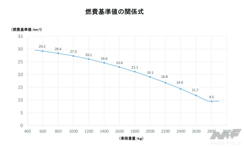 2030年度燃費基準では、車両重量ごとに燃費基準値が設定されている。そのグラフが「燃費基準値の関係式」である。車両重量1000kgなら27.3km/L、1400kgなら24.6km/L、2000kgなら19.1km/L。これらの数字を叩き出すには「何らかの電動アシスト化は必須」と言われる。マイルドHEVかフルHEVか、あるいはPHEVか。ICE車だけで目標をクリアするとしたら、排気量が小さく車両重量も軽い車でなければ難しい。