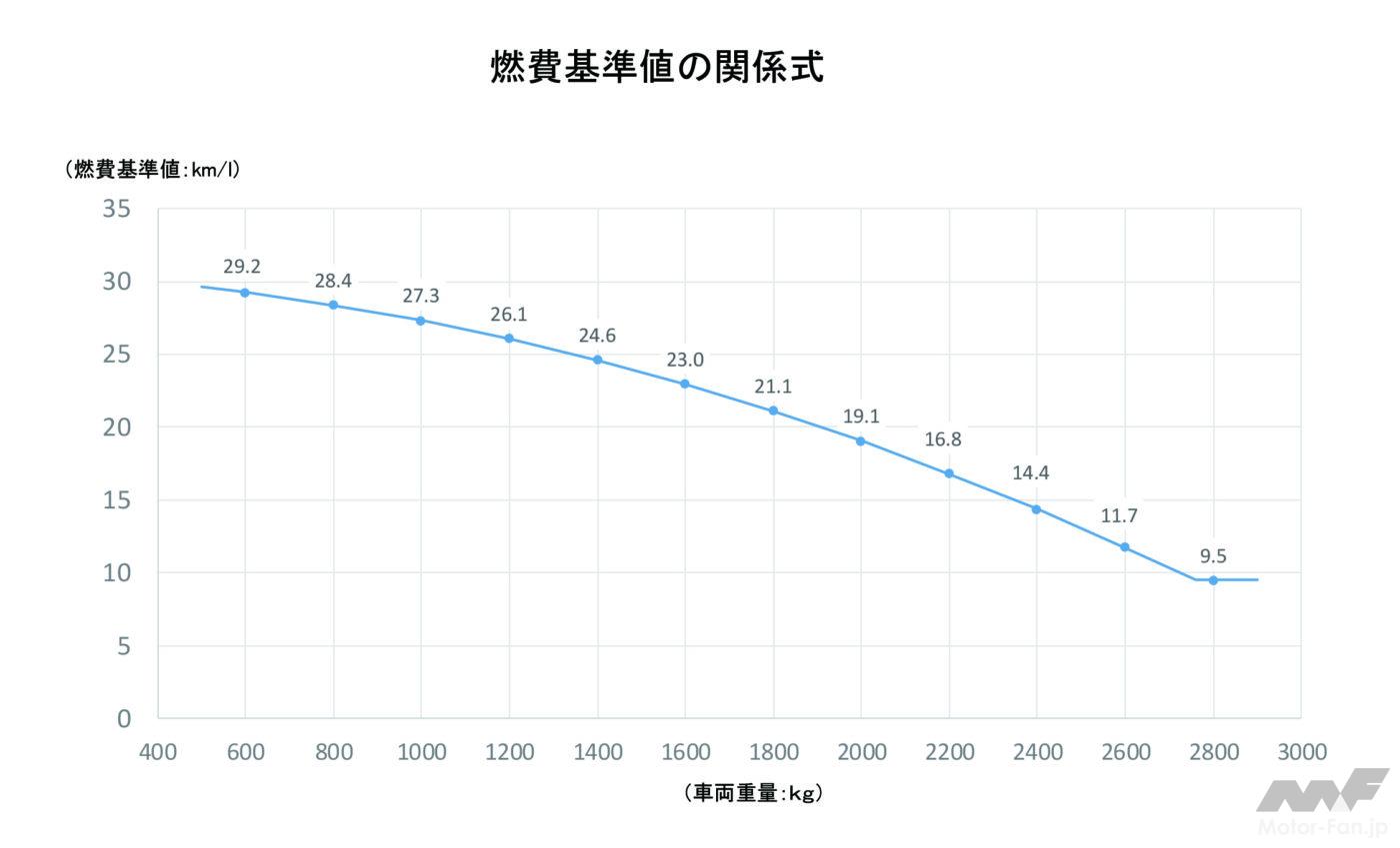 2030年度燃費基準では、車両重量ごとに燃費基準値が設定されている。そのグラフが「燃費基準値の関係式」である。車両重量1000kgなら27.3km/L、1400kgなら24.6km/L、2000kgなら19.1km/L。これらの数字を叩き出すには「何らかの電動アシスト化は必須」と言われる。マイルドHEVかフルHEVか、あるいはPHEVか。ICE車だけで目標をクリアするとしたら、排気量が小さく車両重量も軽い車でなければ難しい。