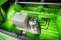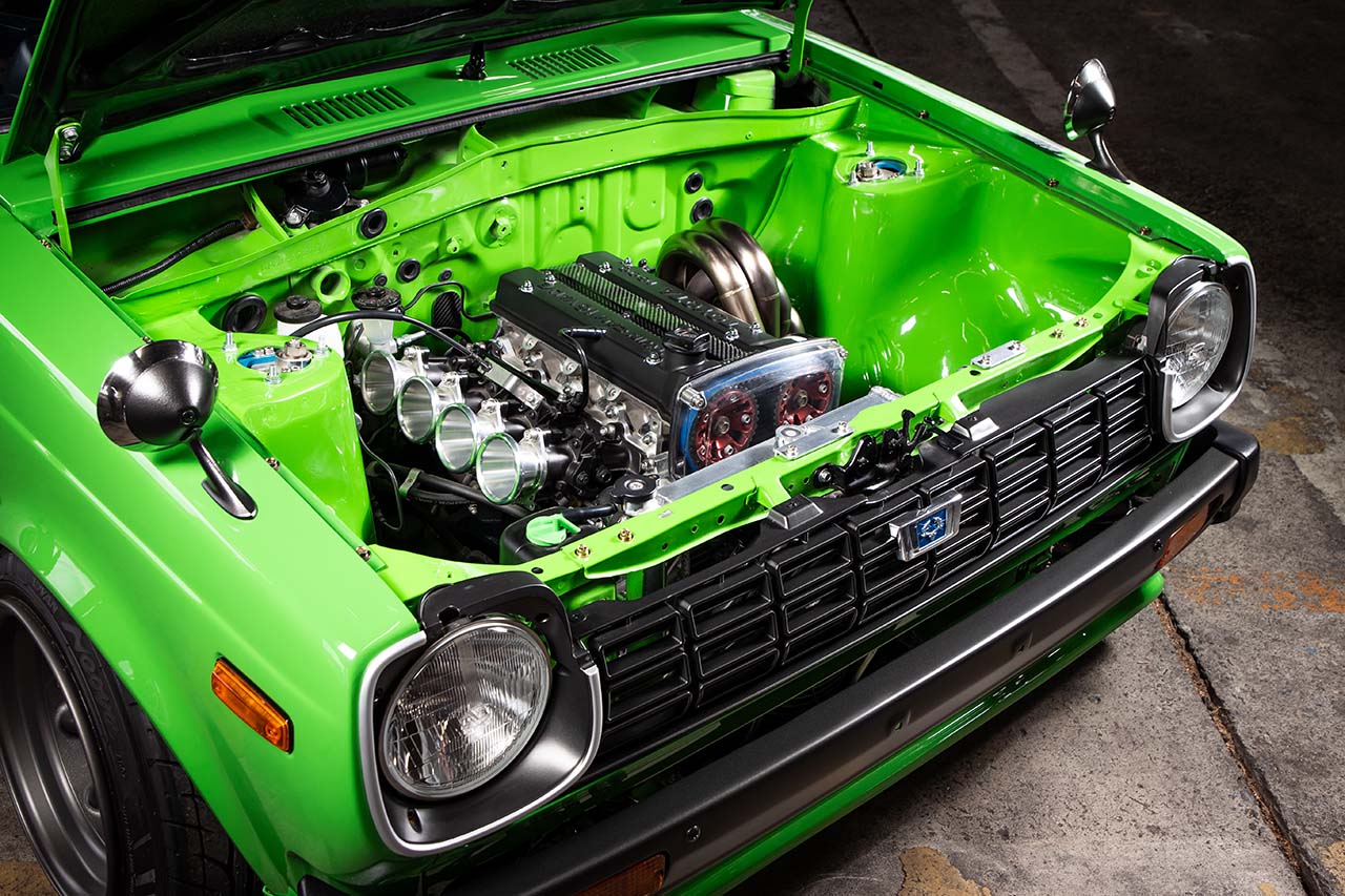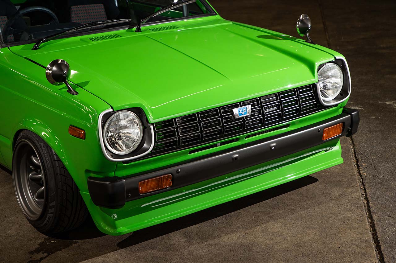 ボディカラーはKP61スターレット純正のグリーンでペイント。もともとドンガラだったため、ボディ全体にサンドブラストを掛け、下回りにはラプターライナーで下地処理を行った上、室内やエンジンルームも含めて丸っと塗装。エンジンパートとボディの作業を分けて効率的に進める方法も、このKP61の製作過程で要領を掴んでいったそうだ。