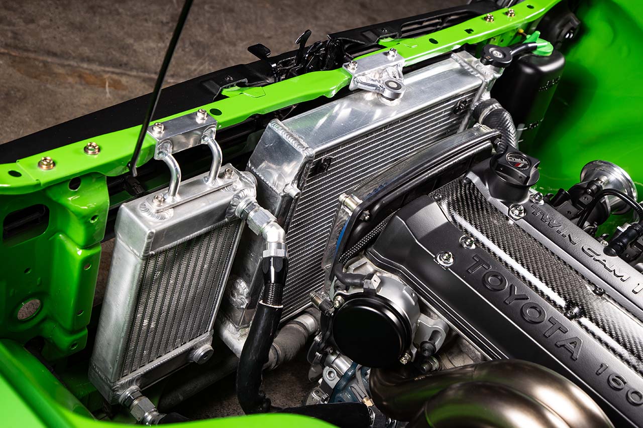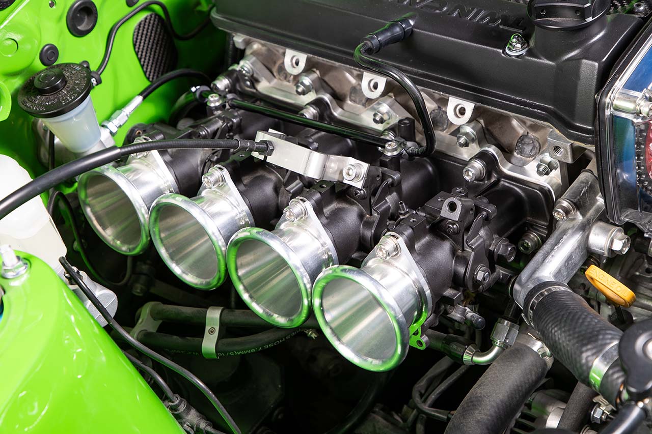 4連スロットルはAE111純正。上下反転させて装着するアダプターを使い、インジェクターが下に、スロポジセンサーが奥に行くレイアウトとすることで、見た目のすっきり感も高めている。デスビは純正をベースに内部を加工。1番以外の信号を読むポイントは削り落としてある。エキマニはパワークラフトの5V用を少し加工して取り付け。ポリッシュをかけて見映えもアップした。ラジエターはシビック用として販売されているものを横倒しにしてレイアウト。HPIのオイルクーラーも備わり、水回りとオイルの配管もすっきりとさせている。