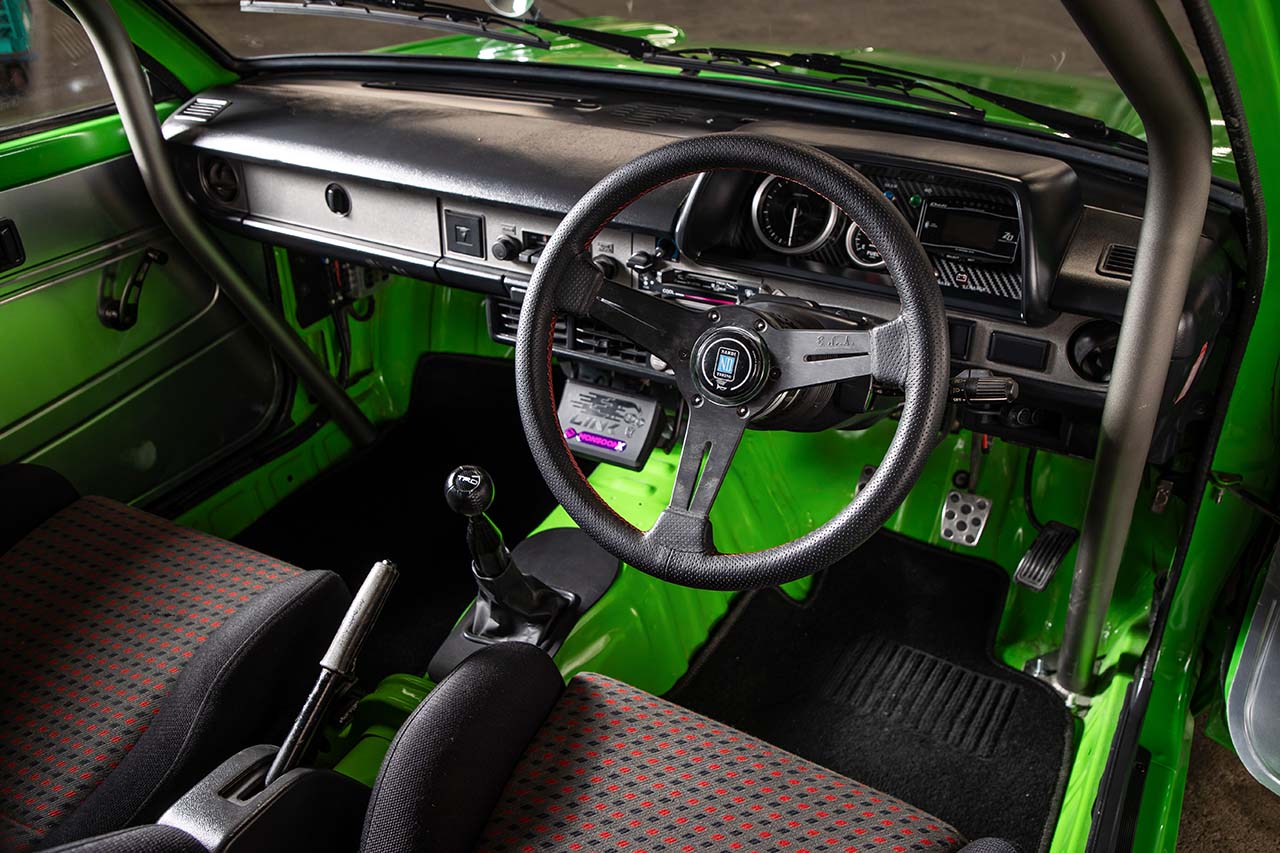 ダッシュボードも状態のいいものをヤフオクでポチって装着。ロールケージも組まれてスパルタンな印象だが、室内もグリーンだと不思議にポップな印象も受ける。ナルディのステアリングにはクイックリリースも装着。