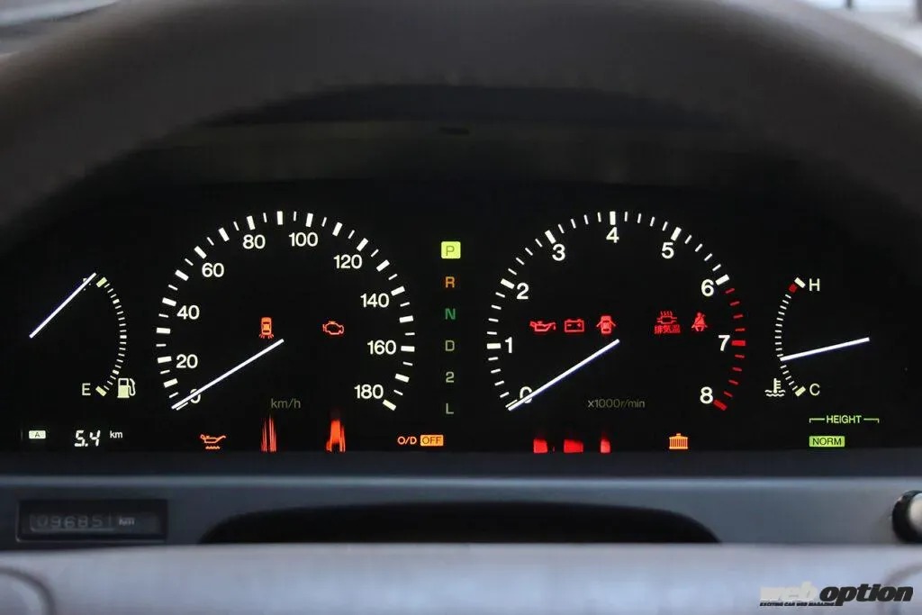UCF20も基本的に同じデザインを採用。水温計と燃料計の目盛りやATポジションインジケーターに違いが見られる他、最下段には車両の状況を文字で伝えるインフォメーションディスプレイが加わった。ちなみにUCF10系前期型はオプティトロンメーターを採用しながら、オドメーターだけはアナログ式となる。