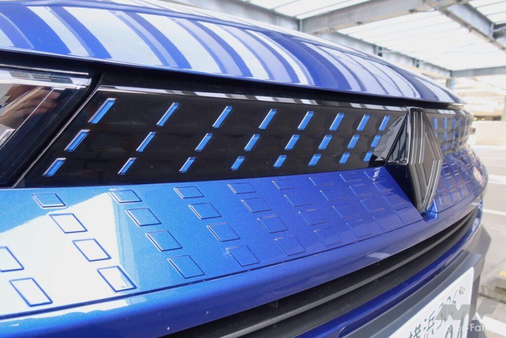 リヤランプのグラフィックにルノー各車の特徴であるCの字は残っているが、フロントからは消え、ヘッドライトは切れ長になり、バンパーサイドに特徴的なグラフィックのデイタイムランニングライト(DRL)が配されている。DRLはルノーのブランドロゴであるロザンジュがモチーフだそう。ポリカーボネート製のフロントグリルには、中央のロザンジュが水面に落ちた際の波紋のように模様が広がっている。