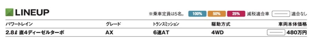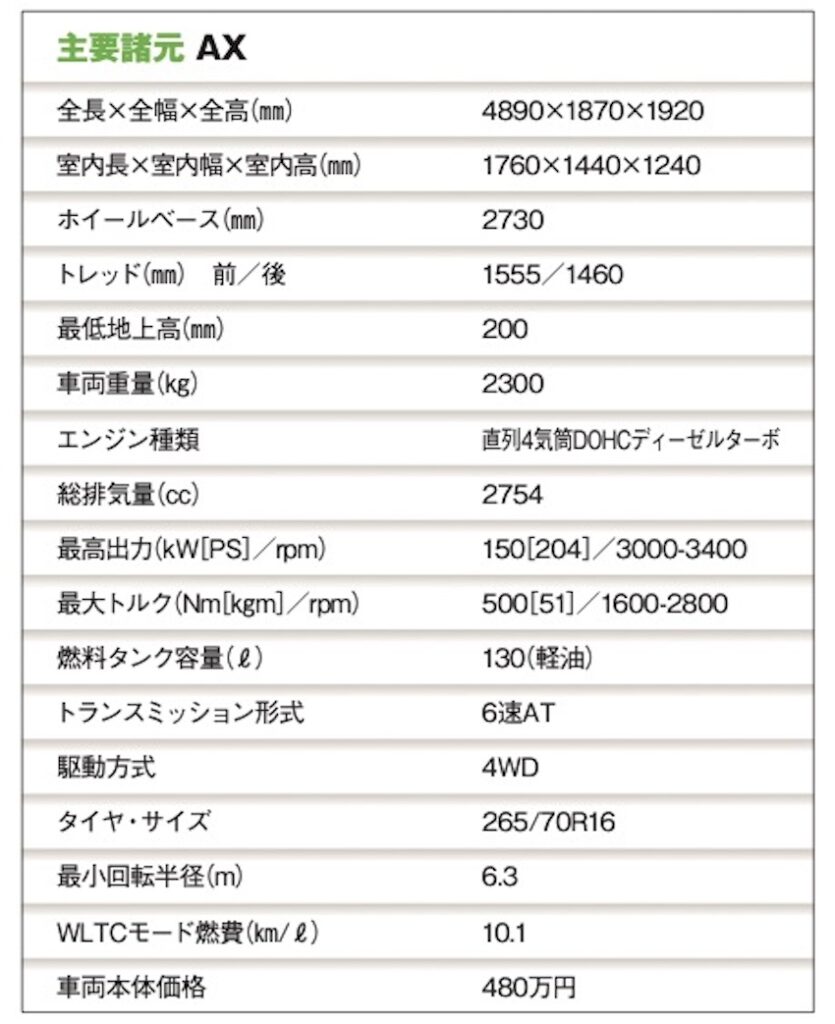 エンジンは2.8ℓ直列4気筒クリーンディーゼルターボで、最大トルクの500Nmを実用回転域で発揮する。この粘り強さは、デコボコの激しい悪路を慎重に進むときも優れた効果を発揮する。足まわりは四輪に車軸式を採用して、柔軟に伸縮する。最低地上高も200㎜で悪路走破力は高い。耐久性の優れたラダー(梯型の)フレームに、エンジンやボディを架装する。