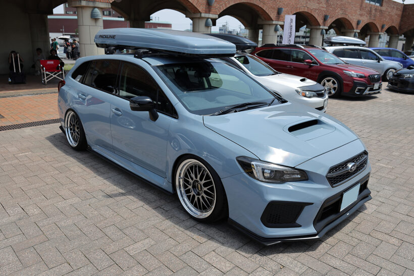 1.6Lのレヴォーグを1年くらい乗り、2Lの当車に乗り換えたオーナー。「この色が出たのが大きい。試乗してやっぱり違うな」と、ボディ色、エンジンの違いが乗り換えの決め手になった様子。そしてレヴォーグでカスタムにも目覚め……。オーナーはSUBARU派というよりはレヴォーグ派なのかも!? 当車のパッと見の第一印象は、非常にバランスが良い、というモノ。エアロなど大物に頼らず、車高、ホイール、さらにルーフボックスまで総合的にコーディネイトしていたのだから! ちなみにルーフボックスは、ボディ同色で塗装する徹底ぶり。車内も、シート生地に合わせて、ウルトラスエードのオプション品を導入している。