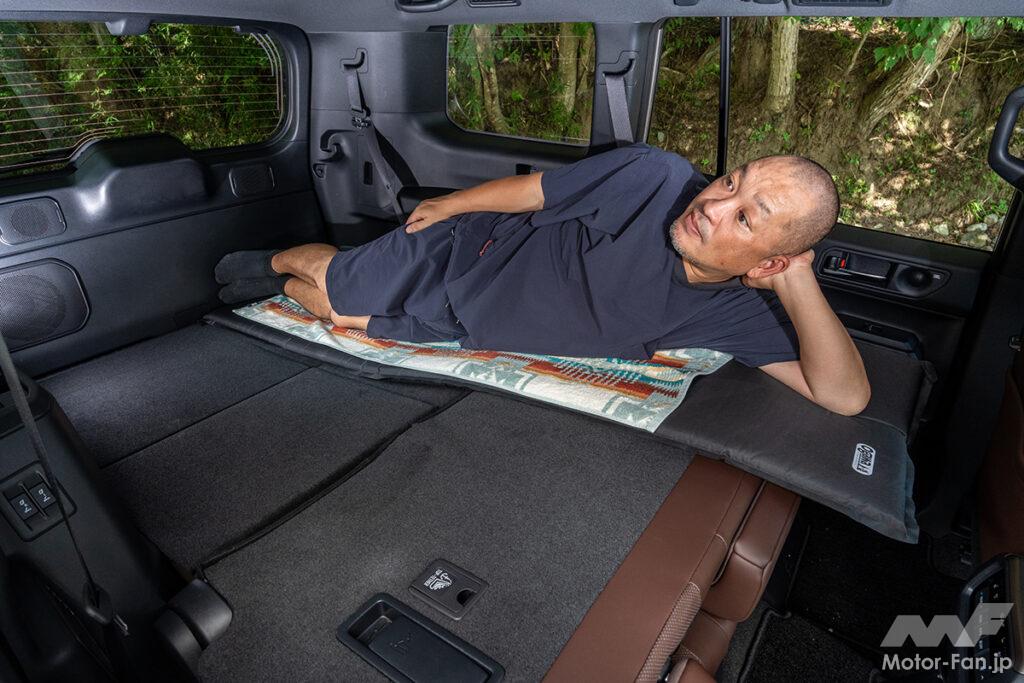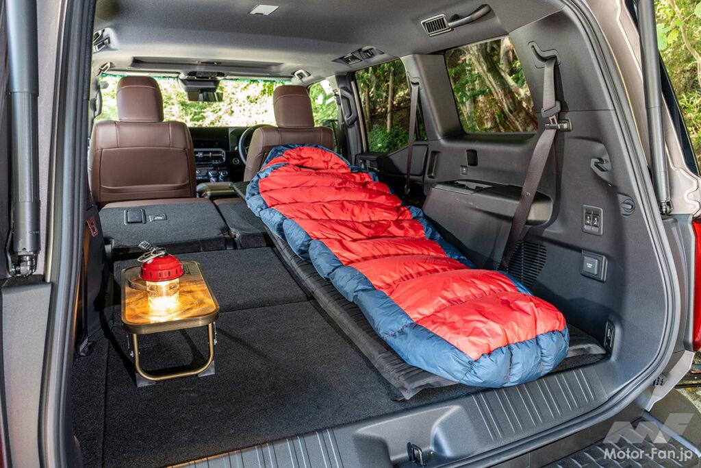 今回車中泊した“250”は3列シートの7人乗り。電動で格納できる3列目シートは、格納すると凹凸がほとんどない平らなスペースを簡単につくれる。あとは2列目シートを前倒しするだけ。2列目シートは座面を持ち上げてタンブルさせることも可能だが、就寝スペースを作るにはタンブルせずに倒すだけが最適。2列目を倒した時、微妙に傾斜ができるが、寝転んでみるとこの傾斜が丁度いい感じに。直接寝転ぶには少々硬すぎるので、キャンプマットなどを敷けば快適な就寝スペースが完成。身長170cmの著者がしっかり足を伸ばした状態で寝転ぶことができるので、一晩ぐっすり休むことができた。両サイドの壁面は凸凹が少なくスペース的にも余裕があるので、就寝中の寝返りで頭をぶつけるということもなかった。特別な装備要らずで車中泊するなら、“250”がベストチョイス!