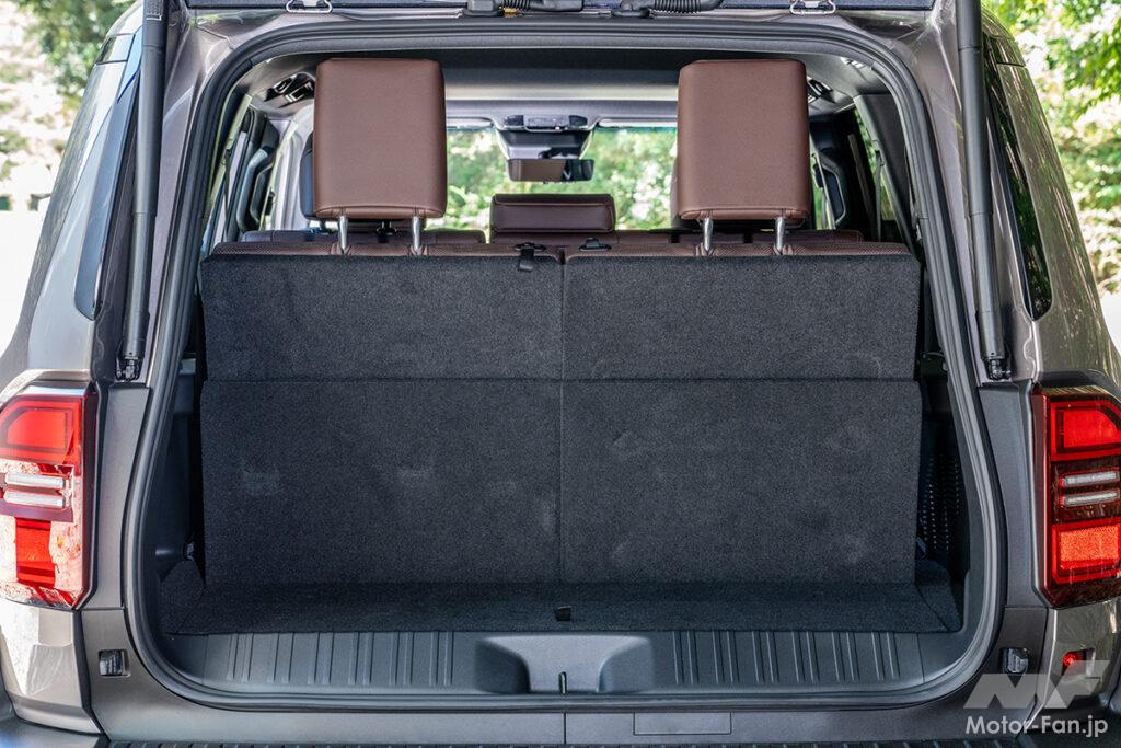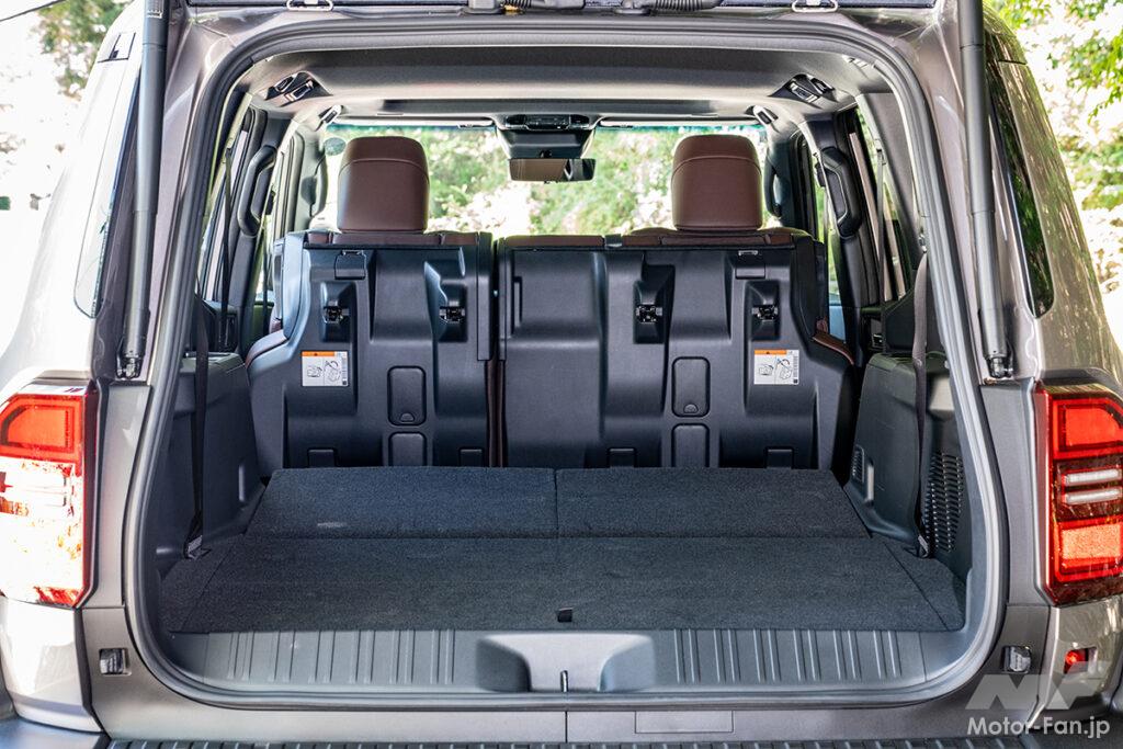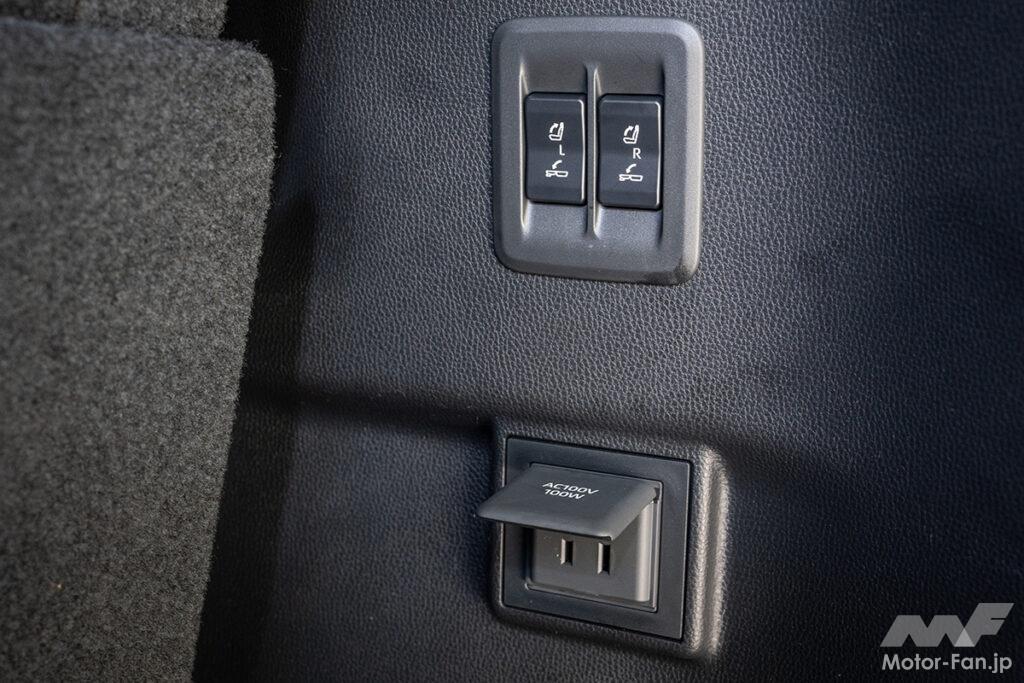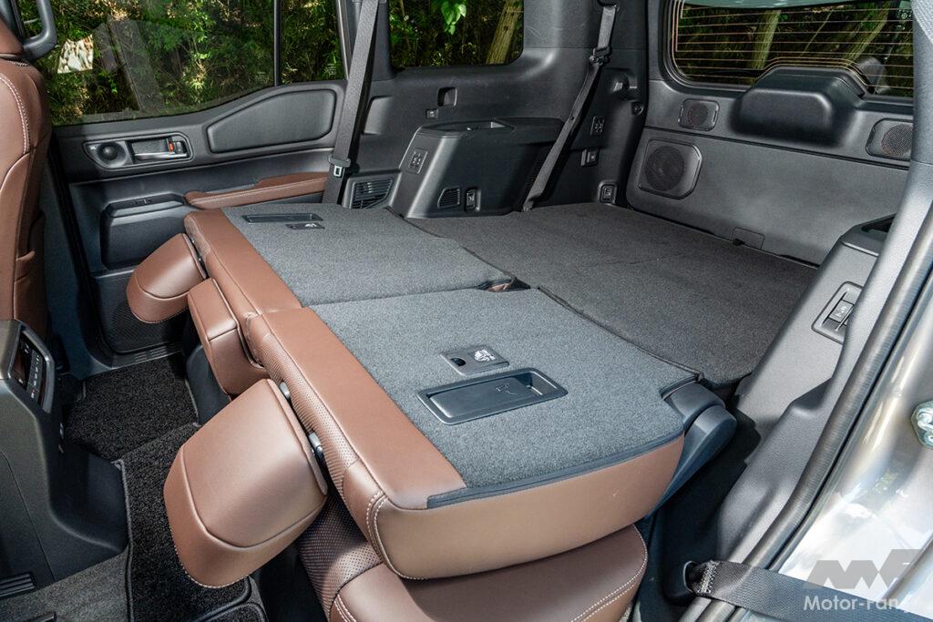 パッと見ても、凸凹がほとんどないということがよく分かる。前席までの荷室長は約2000mmあるが、前席と後席の間に隙間ができてしまうので、寝るポジションに注意したい。3列目は電動、2列目はシートバックレバーによってワンアクションでの折りたたみが可能。2列目をタンブル格納すると室内高を稼ぐことができるので、積載性をさらに高めることができる。