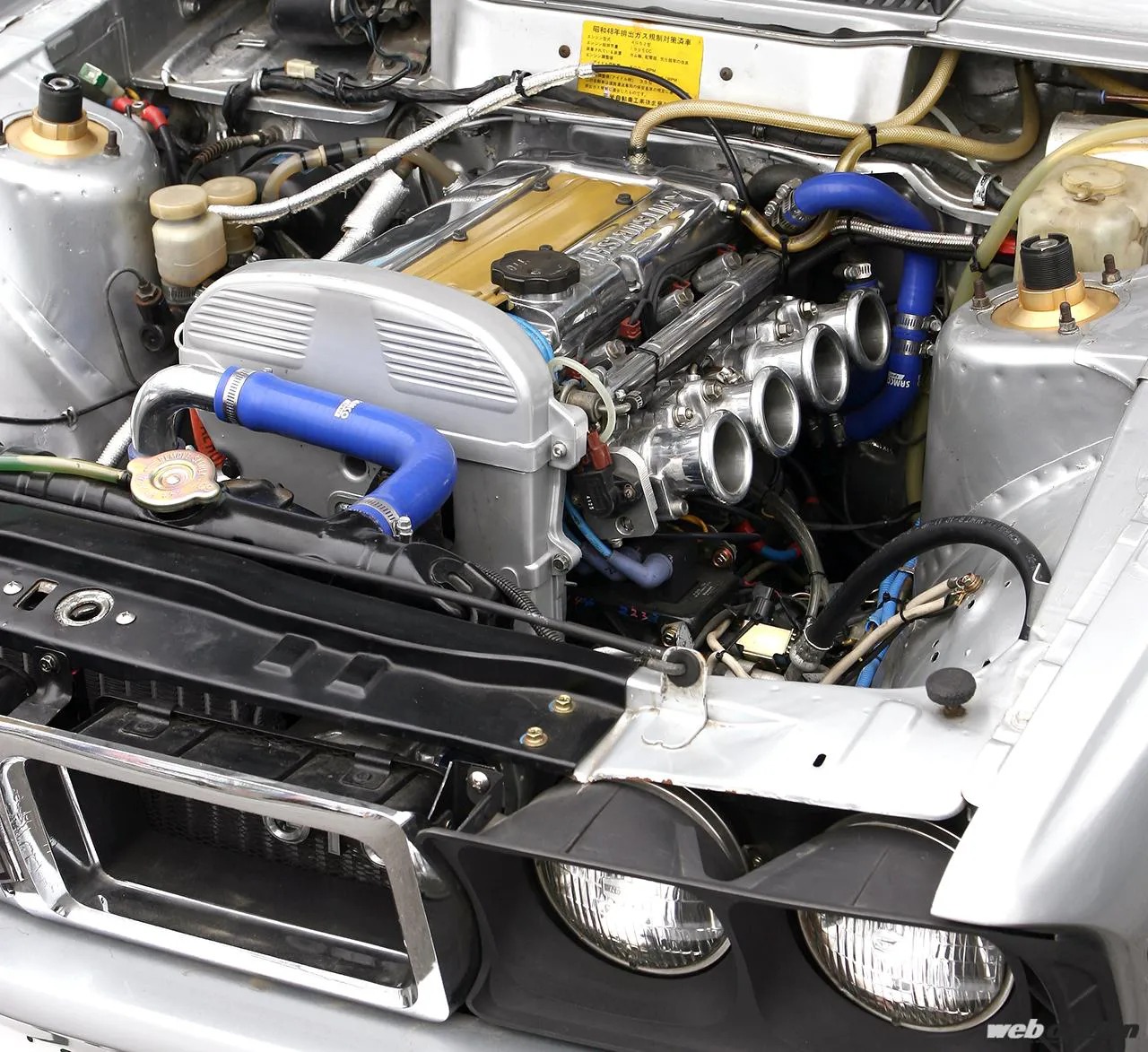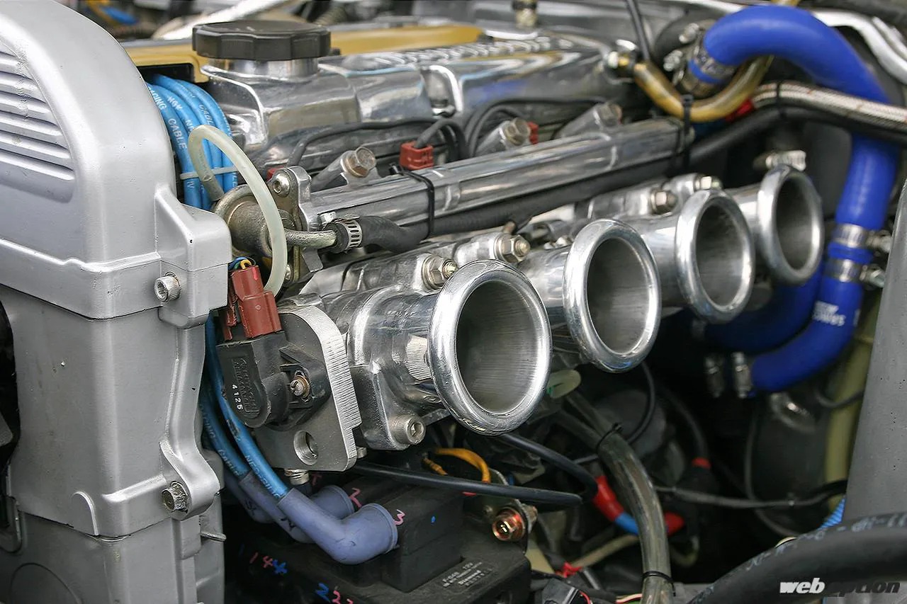 もちろんスモーキーが手がけるだけにノーマルのままというわけはなく、4G63は腰下にRB26用ピストンを組み込んでハイコンプ化し、ヘッドにはハイカムを投入。そしてターボシステムを取り払い、代わりにRB26の純正6連スロットルを2気筒分カットして加工装着している。そう、ハイコンプのNAメカチューンを作り上げたのだ。