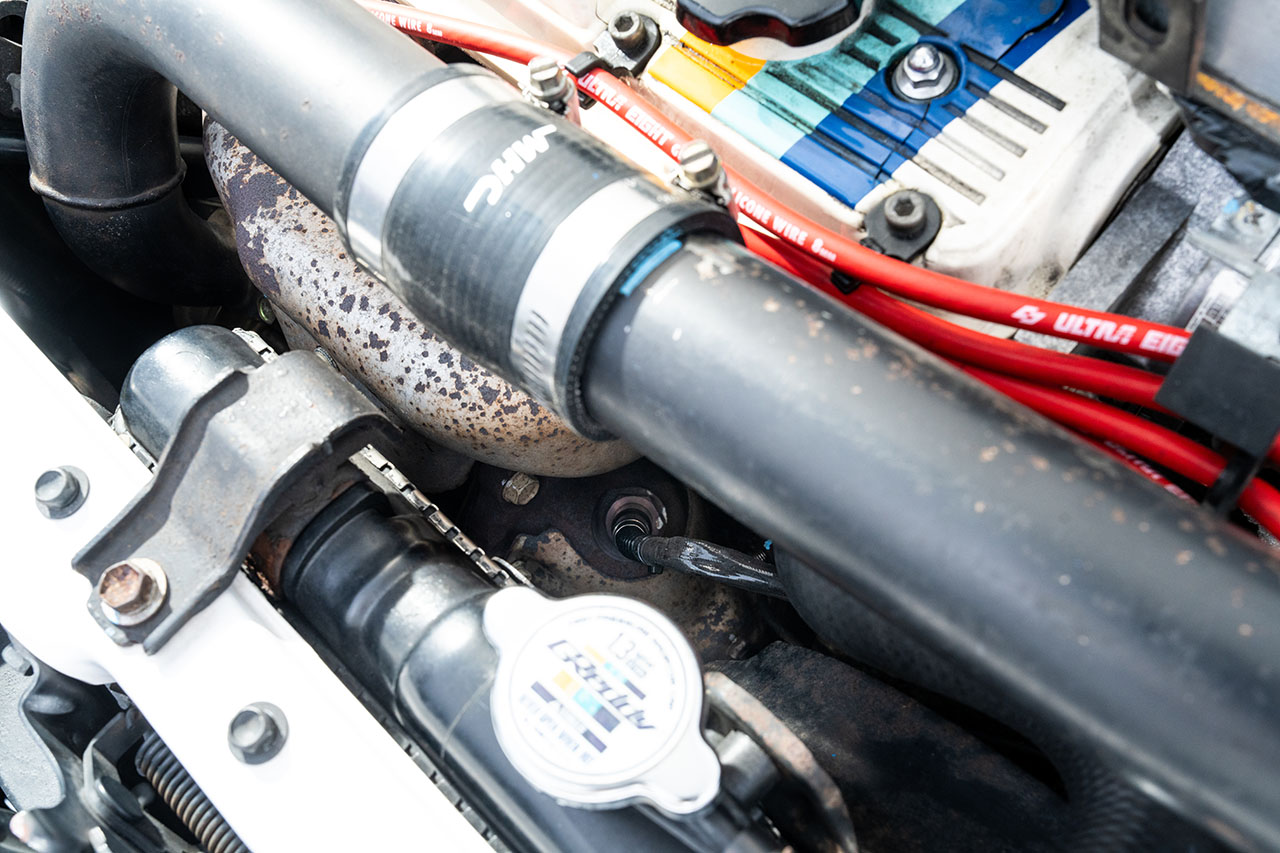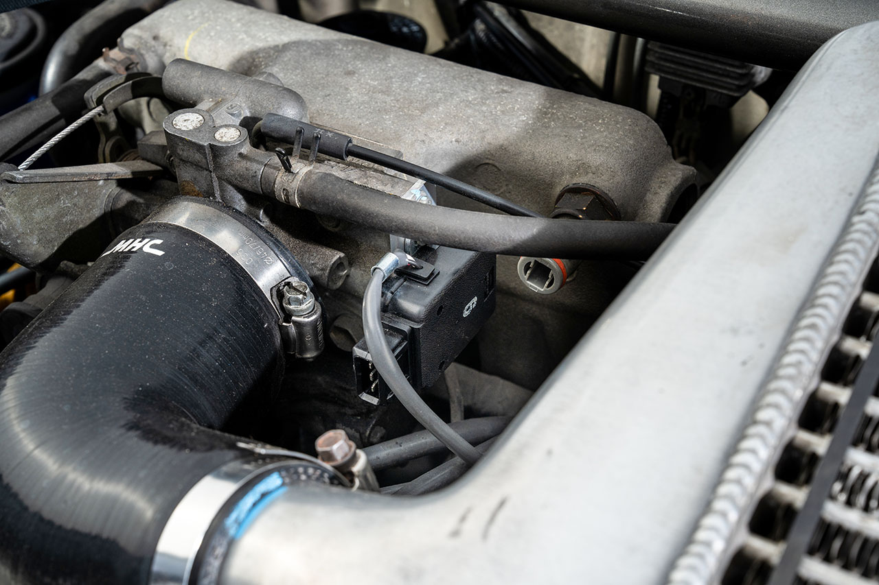 オン/オフのみの判別となる純正のスロットルポジションセンサーでは加速増量の制御が甘くなるため、ワンオフマウントステーを使ってリニア式にアップデート。純正インマニの熱影響を強く受ける吸気温度センサーも高性能なハイレスポンスタイプに換え、インタークーラーのスロットル側タンクに移設した。