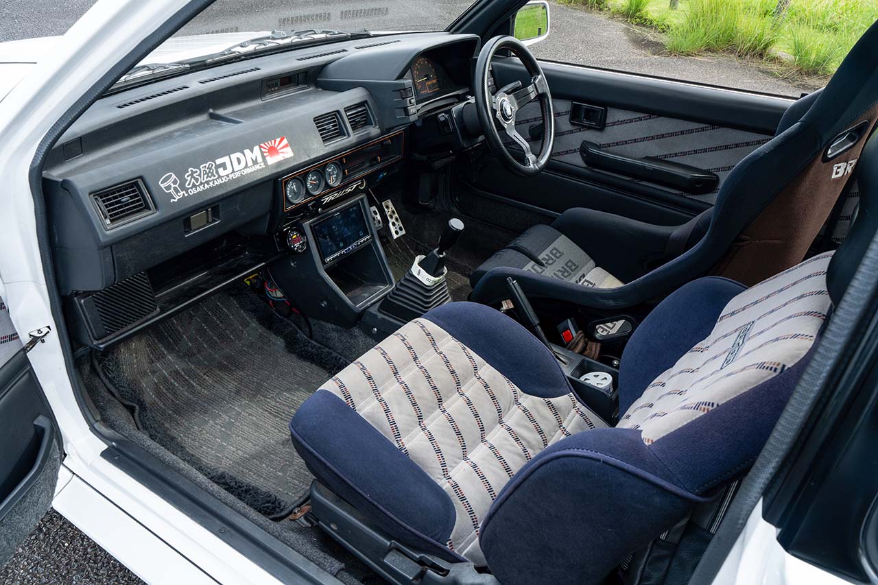 ステアリングやバケットシートでシンプルに仕上げるインテリアだが、80年代のイメージを崩さない52φ追加メーターやディスプレイオーディオで細やかにブラッシュアップ。電動パワステ化も思案中とのこと。