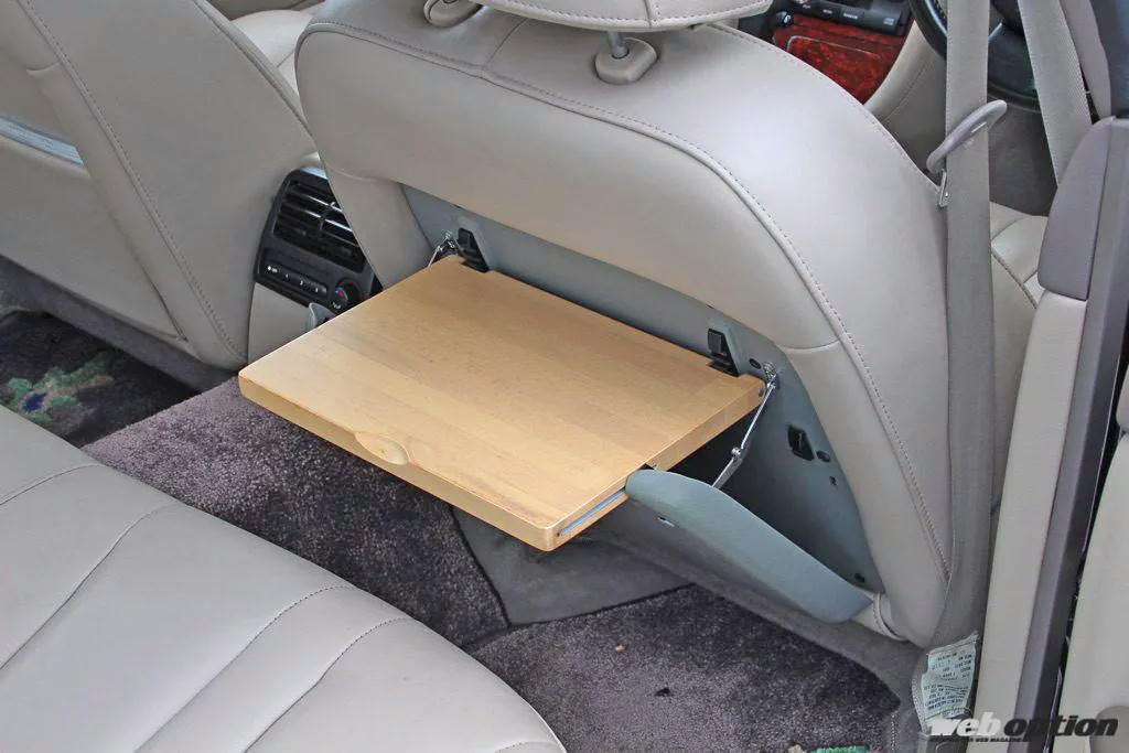 さらに、この個体には今や激レアアイテムとなった純正オプションやアクセサリーが満載。例えば、ハーフシートカバーとの同時装着も可能な折り畳み式シートバックテーブル。当時のカタログを見ると取り付け工賃込み4万4300円のアクセサリーだ。