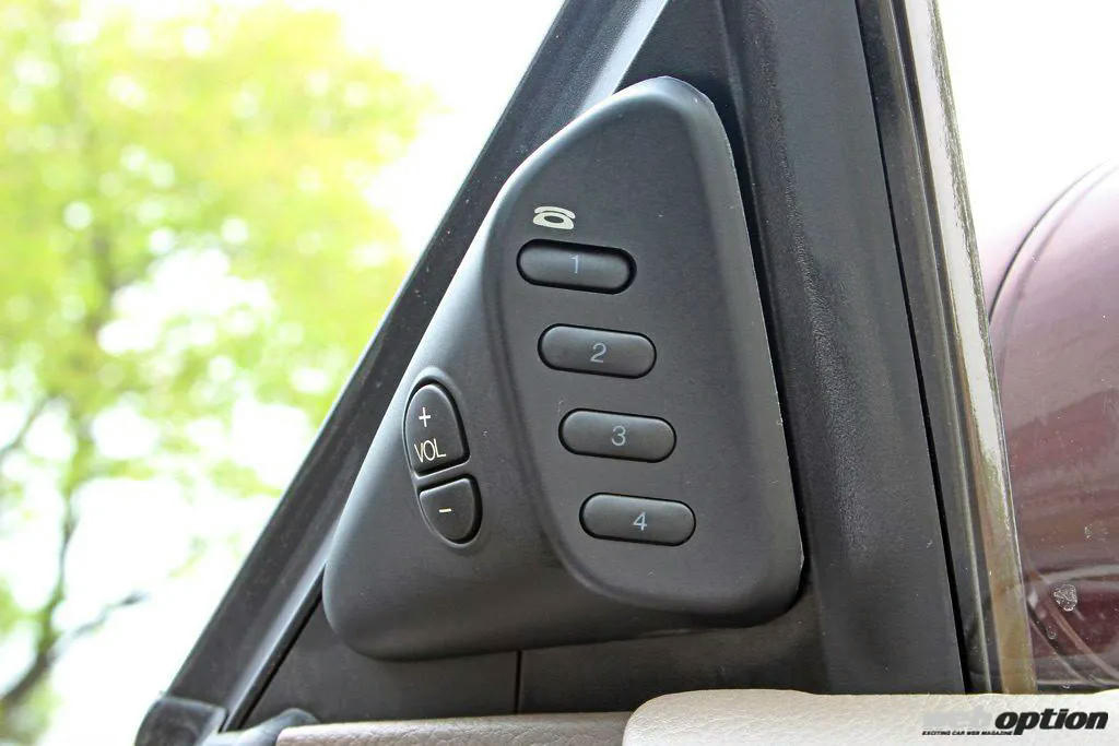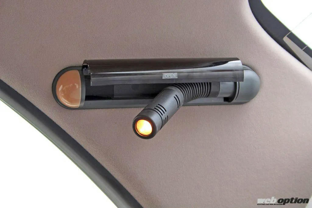 右Cピラー部のパーソナルランプ(1万5500円)や、スピーカーボード中央のビルトイン式カーエアクリーン(三菱製空気清浄器トープ/5万円)も純正アクセサリー。