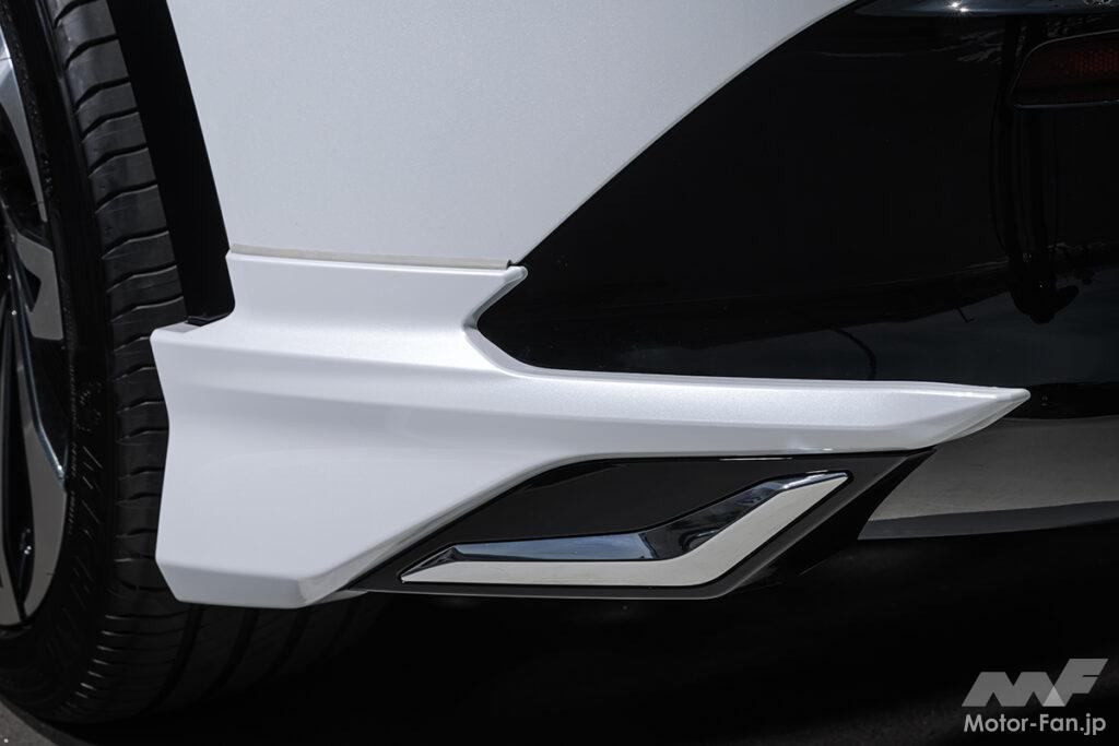 印象的なのはハンマーヘッド感をさらに強調してくれるフロントグリルガーニッシュ。得意のメッキ加飾によって上級感とワイド感、未来感を引き出しているのがポイントだ。フロントスポイラーとリアスパッツにもメッキ加飾を取り入れ、クラウンらしい洗練美を際立たせているのも特徴。ただしサイドスカートも含め、それらの造形はどれもエッジが効いた立体的フォルムで、踏ん張り感や躍動感にも長けているところも魅力的だ。