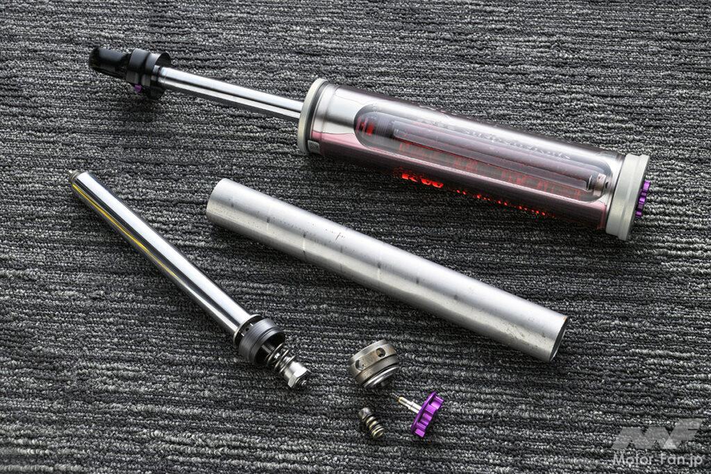 その秘密は独自の内部構造にある。高精度で製造されたツインチューブ式ダンパーは、伸び側と縮み側の減衰力を独立して発生させる2WAYタイプ。役割分担が明確になっているため狙ったセッティングを出しやすいのだ。