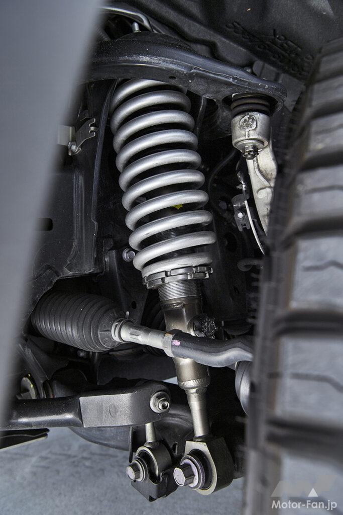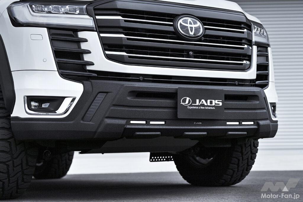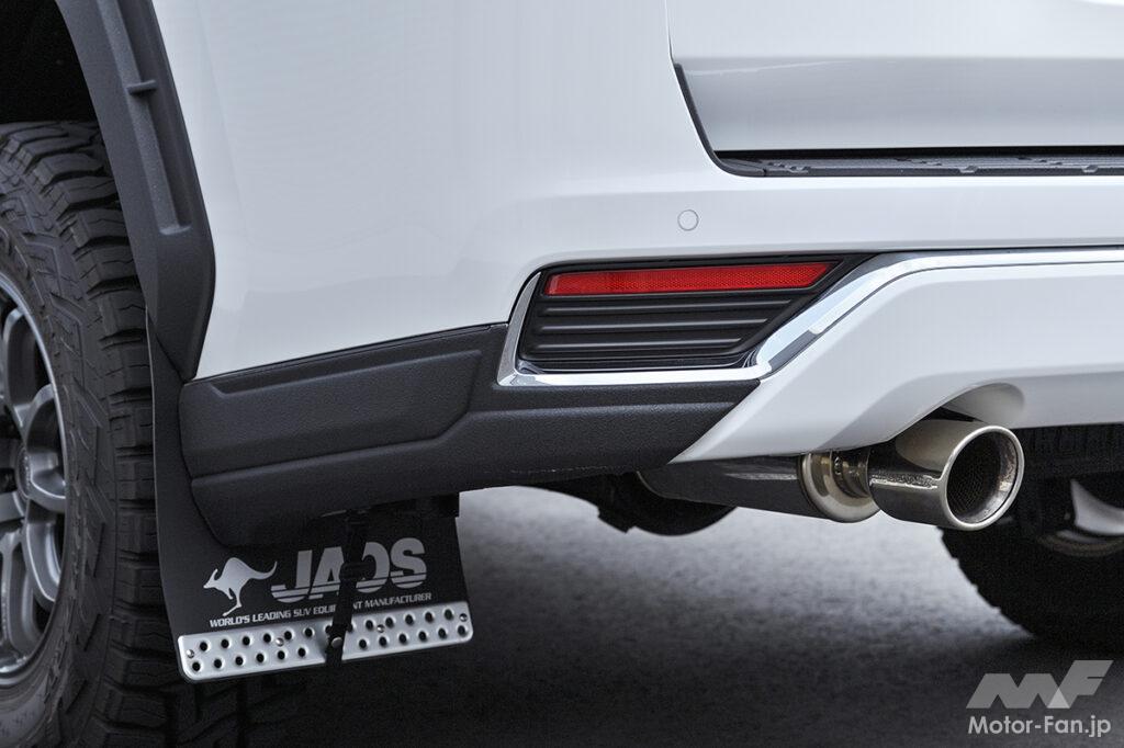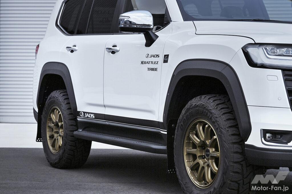 ジャオスのランクル300のボディキットは発売以来好調。発表から約3年が経つが、しっかりとバージョンアップが行われている。そのひとつが、ジャオスが近年力を入れている樹脂パーツに、新色タフブラックを追加したこと。ゴツゴツ系で、製品の強度も高まるというこの塗装。独特の質感はもちろん、オフロード派にとっても頼もしい仕様なのである。このタフブラックは、フロントバンパーガード、フェンダーに採用されている。ちなみにデモカーにつくフェンダーは25㎜ワイド仕様。構造変更が必要になるが、ライバルの一歩先を狙うなら、いち早く当モデルを導入するのも面白い!