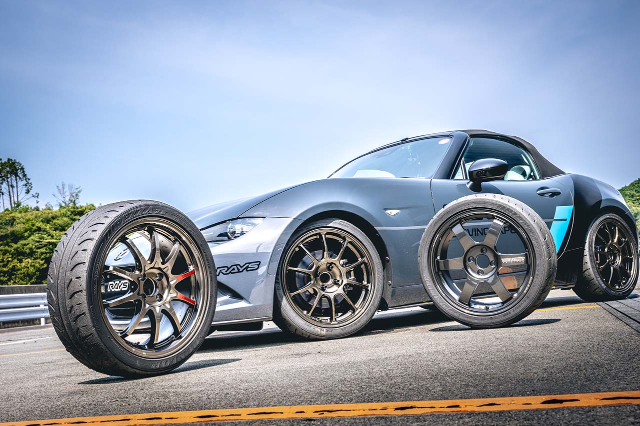 テスト内容はシンプルだ。ノーマルのND型ロードスターに同一タイヤを履かせ、ボルクレーシングの「TE37 SAGA S-plus」「ZE40」「CE28N-plus SL」という3銘柄の鍛造ホイールを4輪すべて付け替え。それぞれの軽さ、剛性、強度といった純粋なホイール性能が走りにどのような違いを生むのか、プロドライバーの視点から体感してもらい、ユーザーのホイール選びの参考となる“忖度なし”の意見を引き出すのが狙いだ。