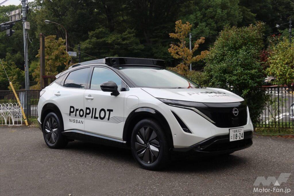 電気自動車のアリアをベースにした次世代プロパイロット開発試作車は、ルーフ前端にLiDARを1基搭載。レーダーセンサーはフロントグリル中央部に1個とボディの四隅に計5個搭載。車両の周囲360度を捉えるカメラは計11個搭載している。