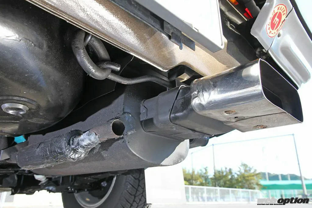 スクエア形状とされたマフラーエンド。メインサイレンサー脇に確認できるサブマフラー的なパイプはサーマルリアクター用エキゾーストだ。