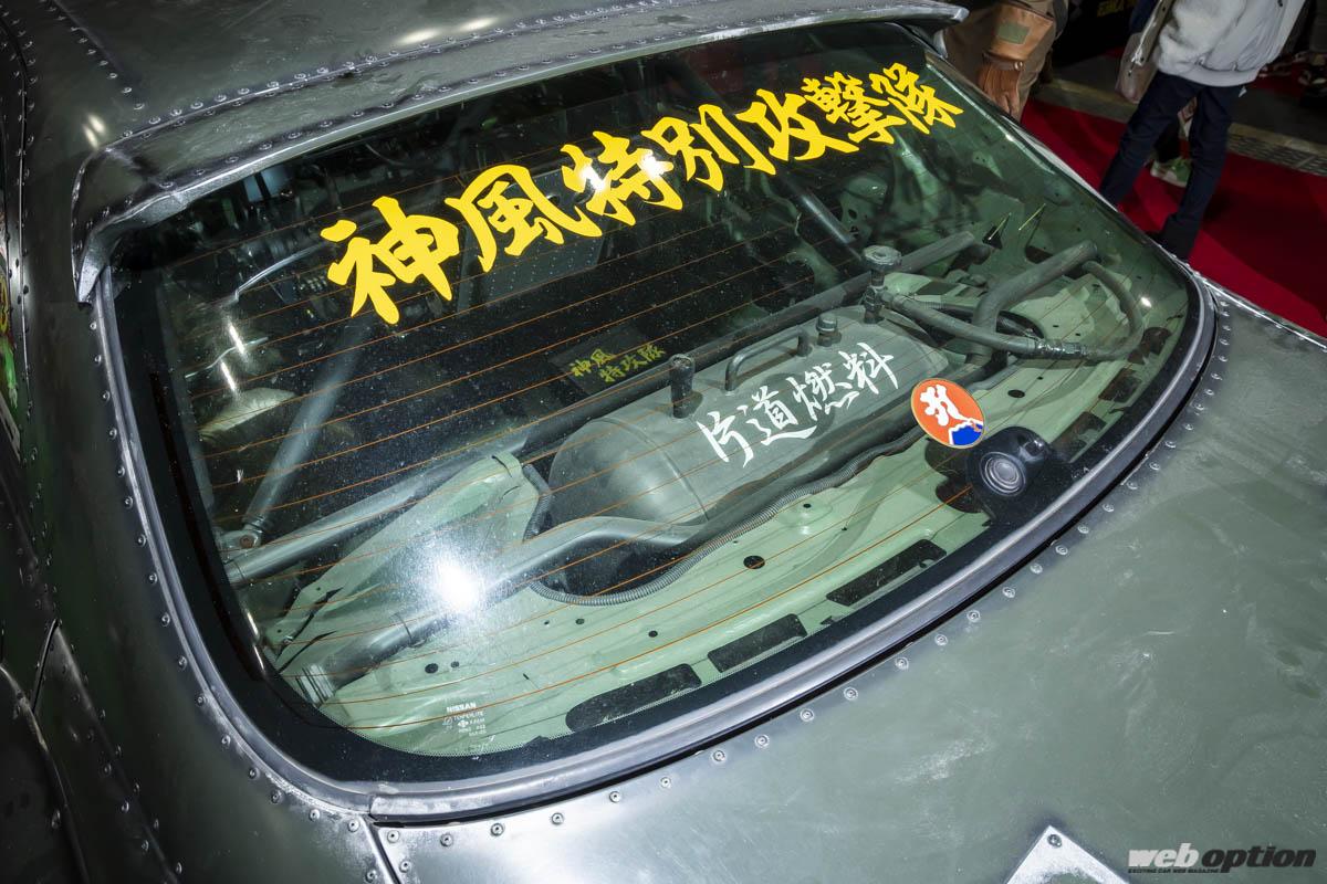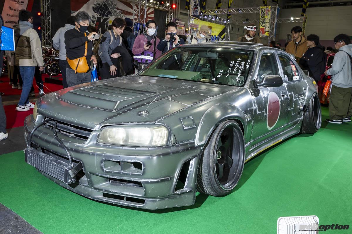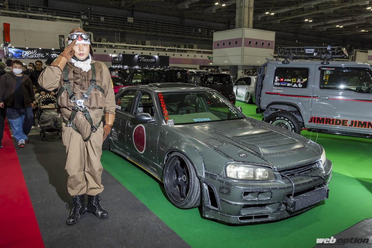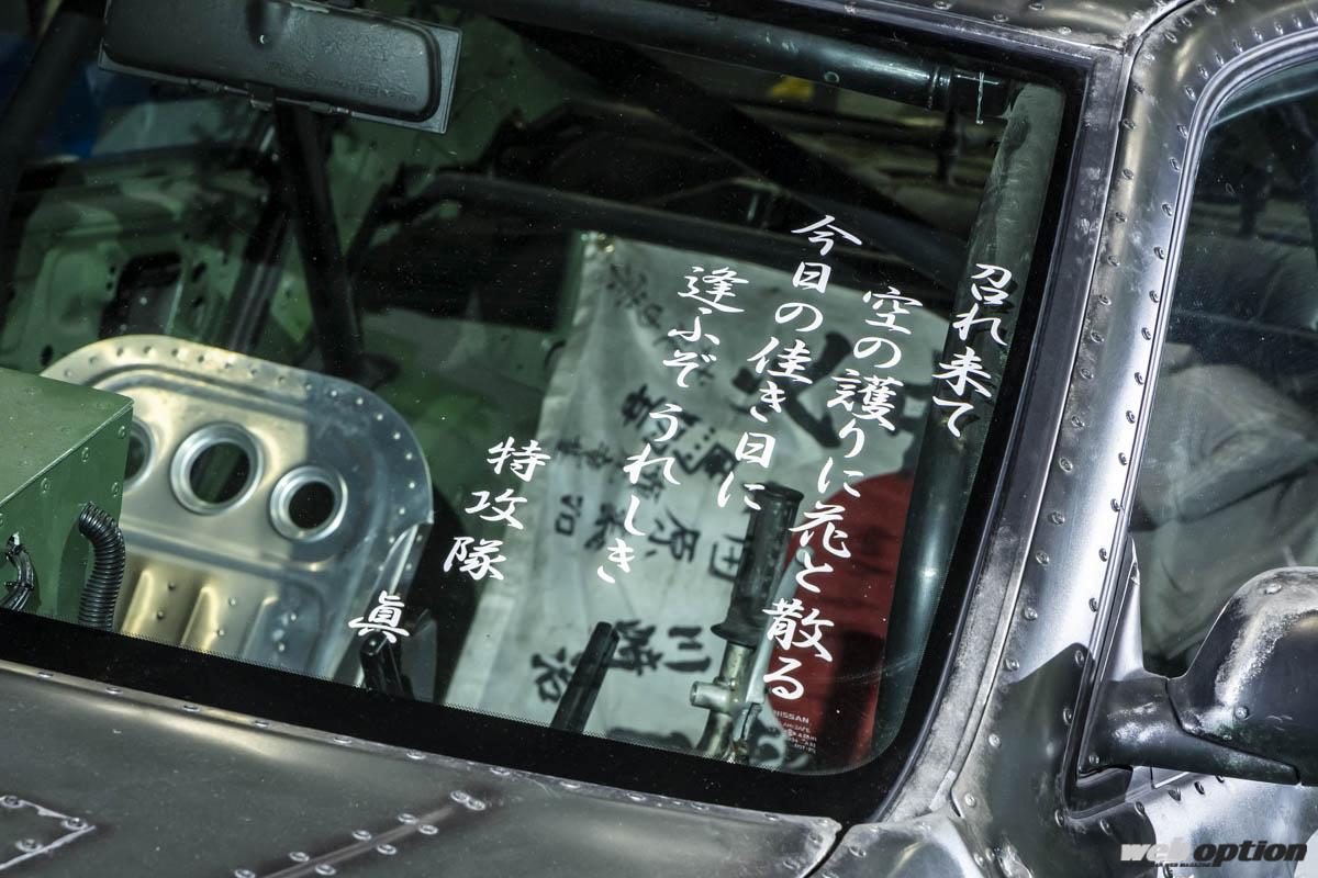 大阪オートメッセ2024に展示されたユーザー車両の中でも、特に注目を集めていたのがこのECR33型スカイライン。鹿児島県の“知覧特攻平和会館”に幼少期から通っていたというオーナーが、零戦をモチーフにDIYを駆使して仕上げた仰天ドリフトマシンだ。