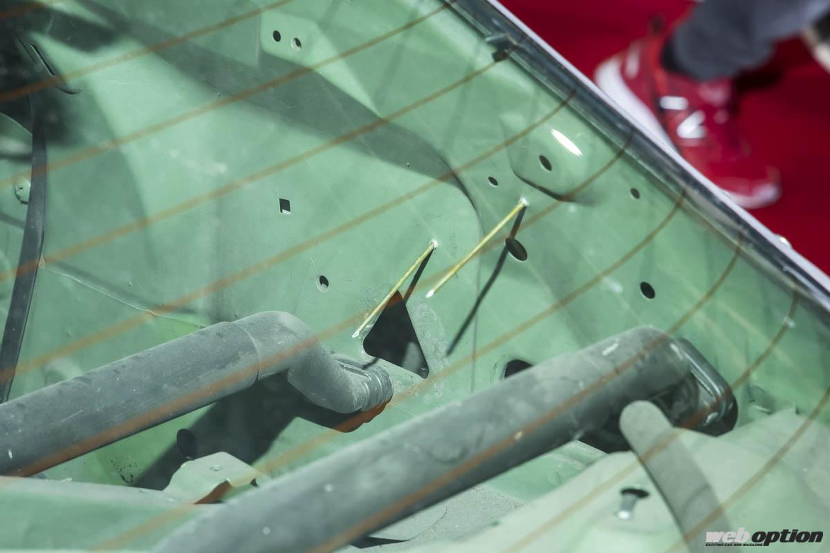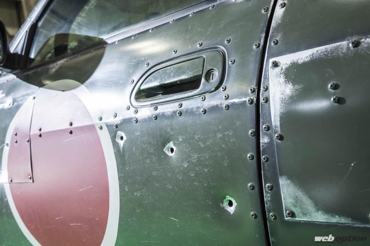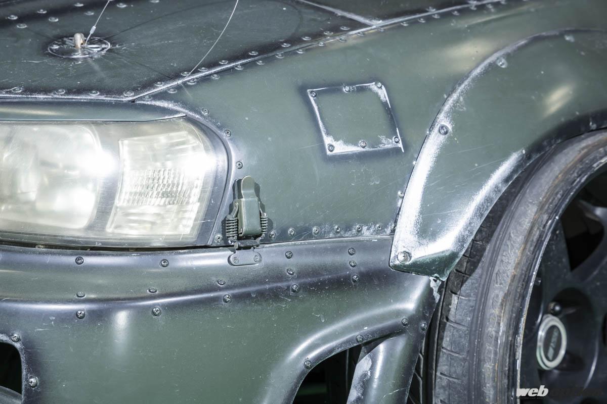 外板の銃創も拘りのポイントだ。猟銃を所有する先輩に実弾を用いた施工を頼んだものの「そんなことできるわけないだろ!」と断られたため、釘打ち機を駆使して銃創を再現した。Cピラーの裏には釘が残されているが、これは検問や職務質問時に『警察官に本物の弾痕ではないことを証明する』ための策だったりする…。