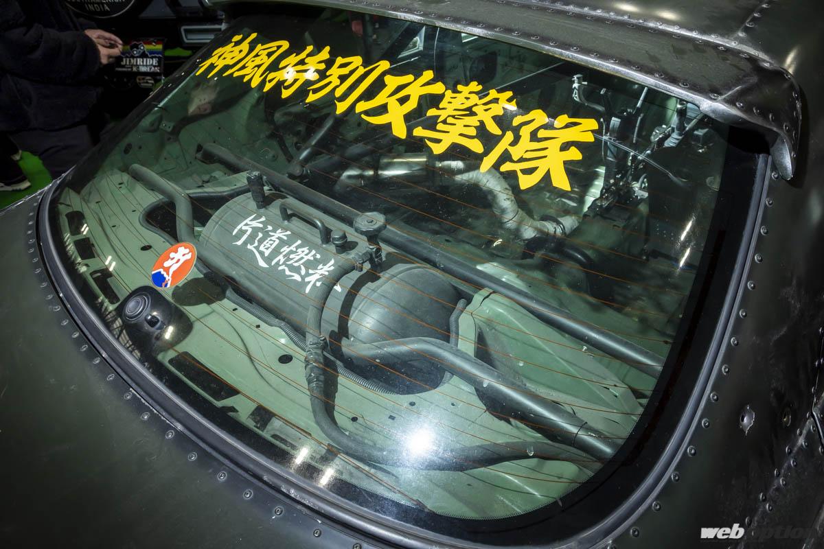 ベース車のチョイスに関しては、零戦の丸みを帯びたフォルムを再現するにはR33系がベストという判断から。ボディカラーは、中島飛行機で製作された“五二型”をオマージュしたグリーンでオールペイント。そこにブラックとシルバーでウェザリング&モールド塗装を実施している。