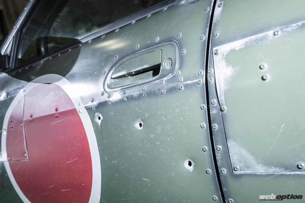 ボディ全体に打ち込まれたリベットは、当初、実際の零戦と同じ“沈頭鋲(ちんとうびょう)”と呼ばれる航空機用を使おうとしていたそうだが、沈頭鋲はFRP部に使えないため、泣く泣く通常のリベットに切り替えたのだとか。ちなみに、リベットの総数は衝撃の5600発! 「真夏に1週間くらいかけてやったんですが、熱中症になりかけました…」とオーナー。