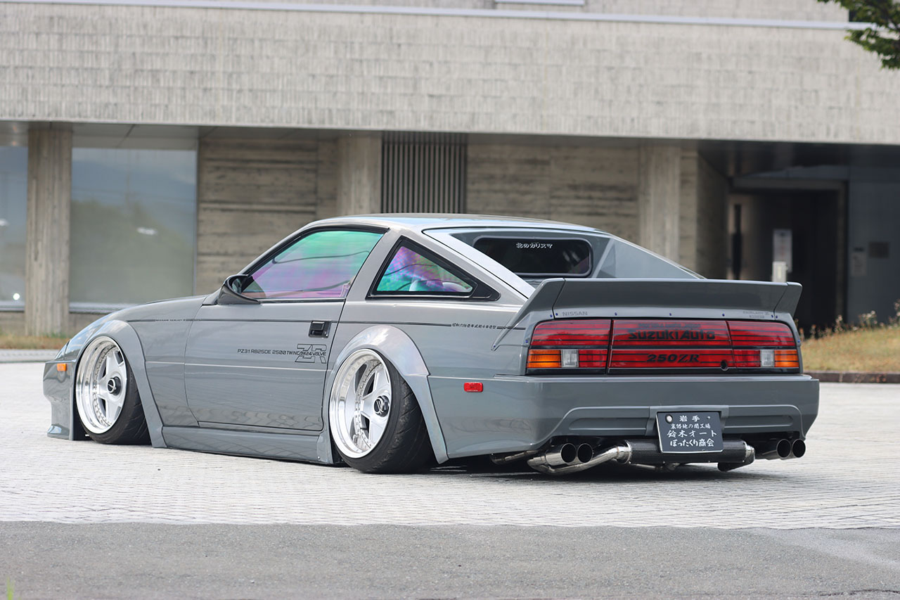 リヤにはアイローネゲートとダックテール風リヤウイングを装着。S130後期をイメージしてラインを追加したカミナリのガーニッシュと、パンチングメッシュをあしらったセダン用の横置きサイレンサーが個性を演出する。
