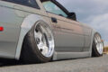 アリものの車高調とエアバッグで製作したワンオフエアサスで全面着地させているが、走行中の車高もかなり低め。エンジンマウント加工でエンジンを2cmほど上げてメンバーより低いオイルパンを逃がしたり、車高ダウンで極端に変化するフロントのキャスターをワンオフしたテンションロッドで対策したりなど、昭和車には想定外のシャコタンゆえに必要となる対策も施してある。