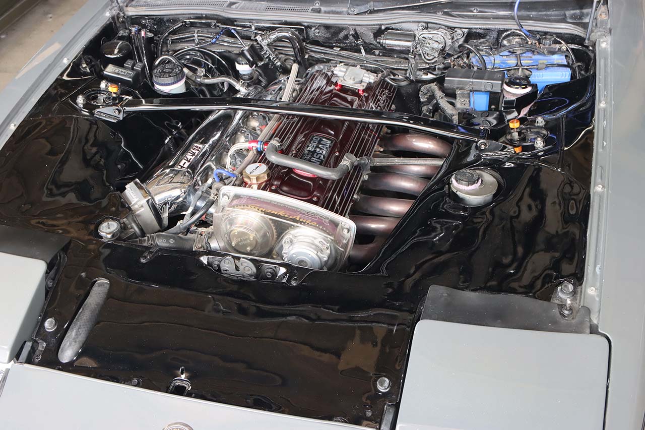 エンジンは、C33ローレルのRB25DEを搭載。これは、直6のNAサウンドへのこだわりからだ。イベントで魅せることを意識して、手曲げのエキマニやメッキ加工したサージタンクをチョイス。黒いFRPパネルはワイヤータック要らずの配線隠し用に製作したが、エンジンルーム内の整流効果なのか水温が安定するという思わぬ副産物もあったそう。