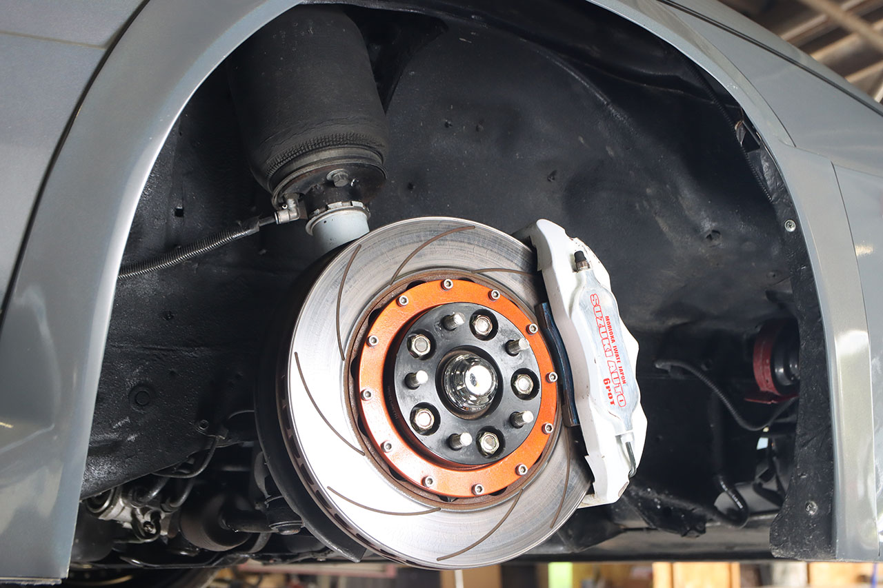 足回りは、300ZRのハブを移植してシルビア用の6ポットキャリパーと330mmローターを装着。エアバッグが取り付けられた車高調は、ムーブ用をベースに純正スピンドルを溶接したワンオフ品だ。