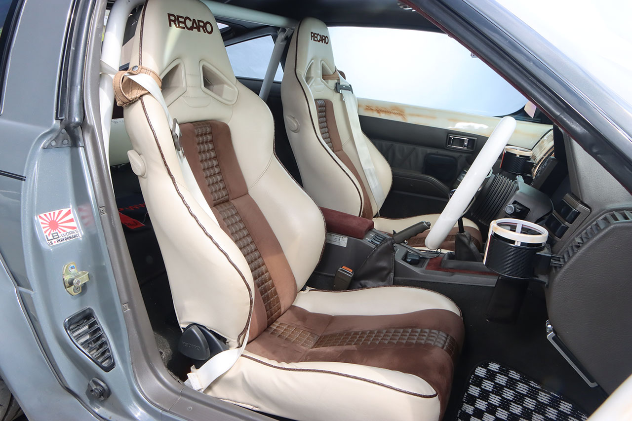 室内は、ベージュとブラウンに張り替えたレカロSR-7に合わせて、ダッシュやコンソールにアルカンターラを張り、インパネやドアにもFRPパネルを製作してカラーコーディネート。窓の手巻きハンドルをモーターで回すパワーウインドウキットや、フジダイナミック・インディ500のホワイトハンドルなど、オーナーの若かりし頃が蘇るパーツチョイスだ。