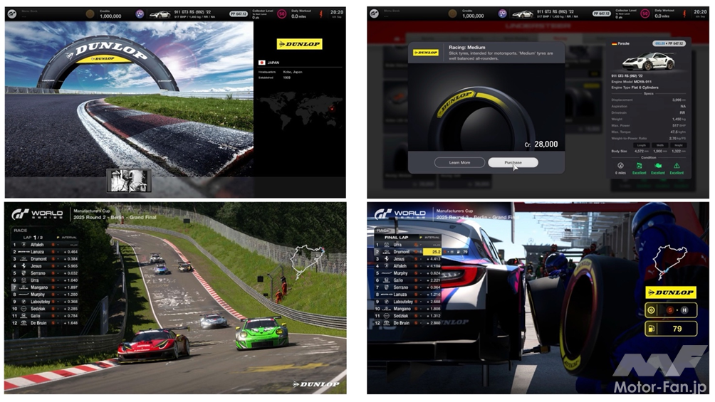 ソニー・インタラクティブエンタテインメントの子会社であるポリフォニー・デジタルが開発した「グランツーリスモ」シリーズは、1997年の初登場以来、PlayStation向けのドライビングシミュレーターとして高い評価を受けており、現在も世界中のプレイヤーを魅了し続けている。2025年の「グランツーリスモ ワールドシリーズ」第2戦(ドイツ・ベルリン)から、住友ゴムは同シリーズ選手権のオフィシャルタイヤパートナーを務める。今後の『グランツーリスモ7』のゲームアップデートでは、DUNLOPブランドがさまざまな形で登場する。