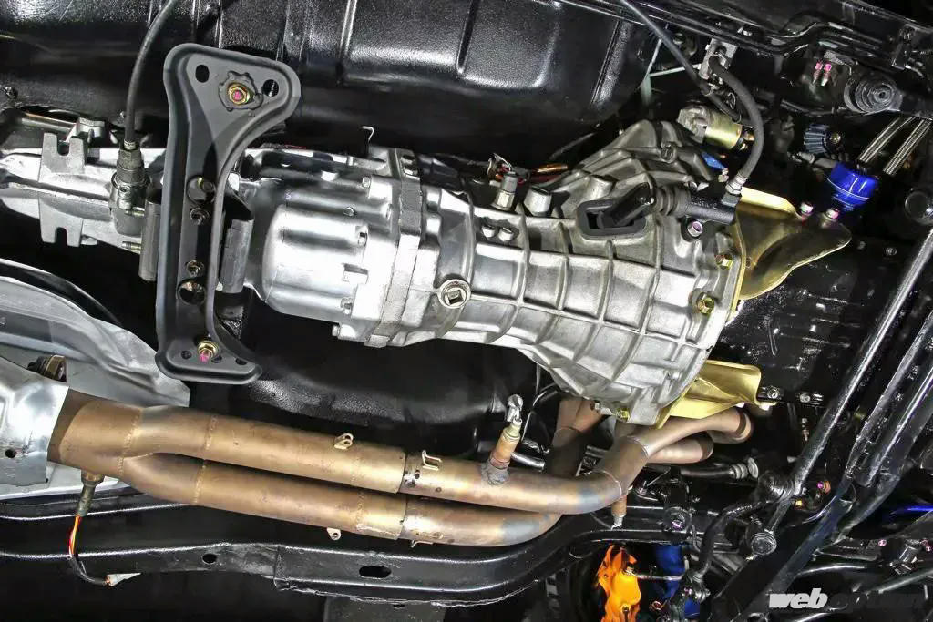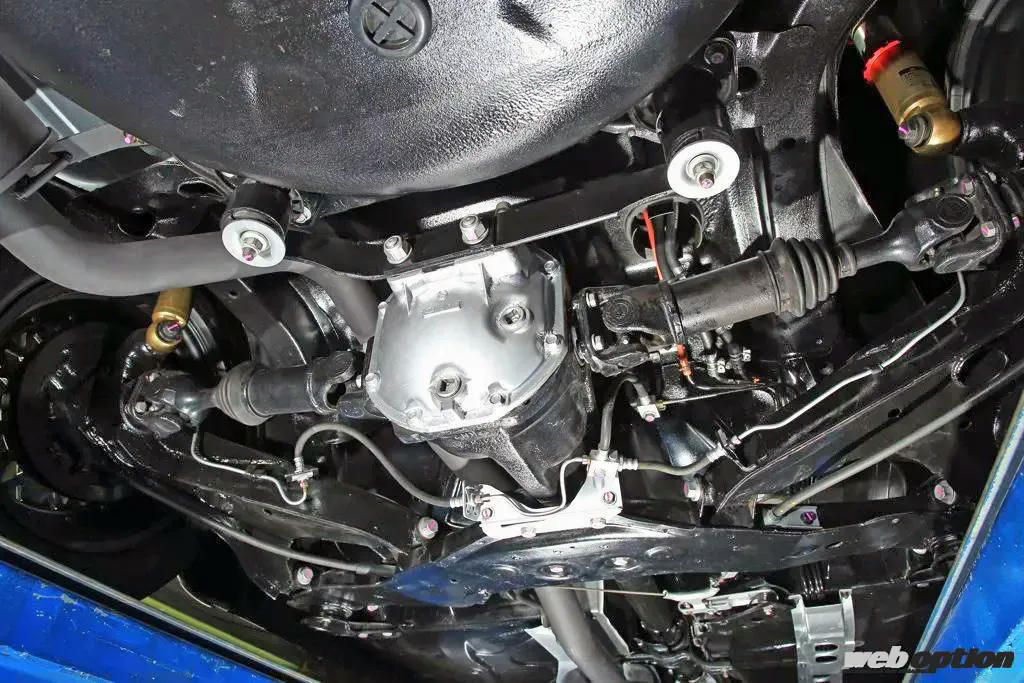 ミッションはHCR32の5速を流用。そこからジャパン純正のプロペラシャフトを経てR200デフに繋がる。ドライブシャフトは純正だ。