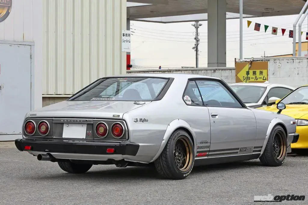 外装は、フロントのチンスポと張り付けタイプのオーバーフェンダーという当時風のカスタムスタイル。リヤに装着されているGTーRエンブレムは、スモーキーのさりげない遊び心だ(C210系スカイラインは本来GT-Rの設定がない)。