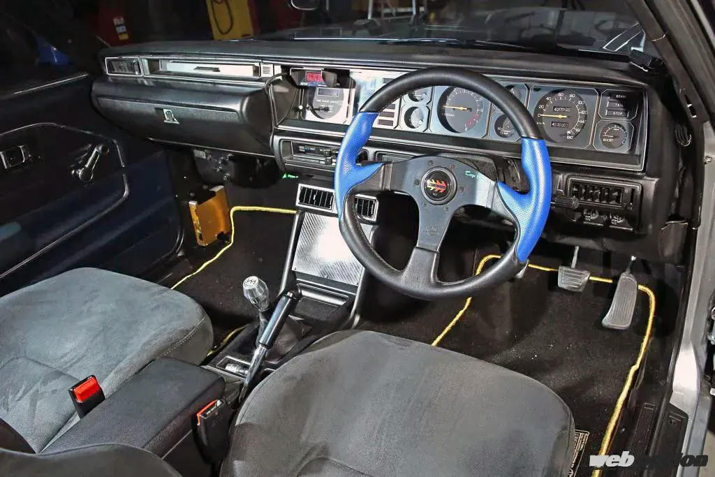 室内はフロントシートをブリッドのリクライニングタイプに変更。コクピット周りはパーソナル360φステアリングを導入したくらいで、あえて追加メーターなどの装着はしていない。