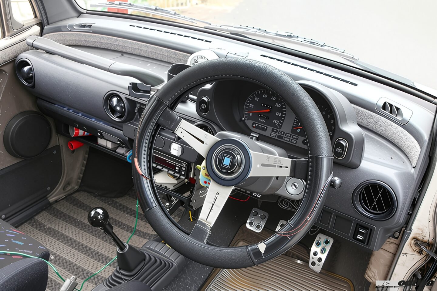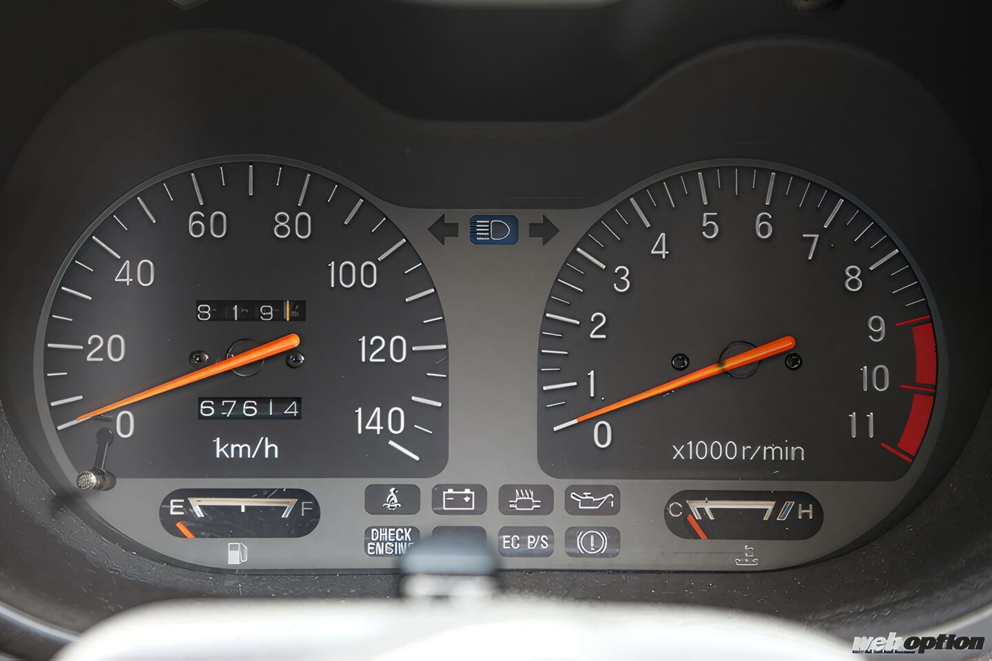 今時の軽自動車に比べると、だいぶ凝ったデザインのダッシュボード。メーターナセルは独立式で、助手席の目の前にはアシストグリップも設けられる。ステアリングホイールはナルディクラシックに交換。9000rpmからレッドソーンが始まる1万1000rpmフルスケールのタコメーターが、5バブルヘッドを持つ高回転型ユニットを搭載している証だ。