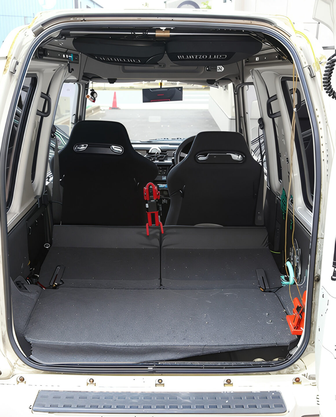 シートは運転席にレカロSR-3、助手席にSR-2を装着。全幅が狭い旧規格の軽自動車だけに、外側ショルダーサポートとサイドウインドウのクリアランスはギリギリだ。また、運転席はローポジション化が図られ、ミニカトッポとは思えないような好戦的ドライビングポジションとされる。